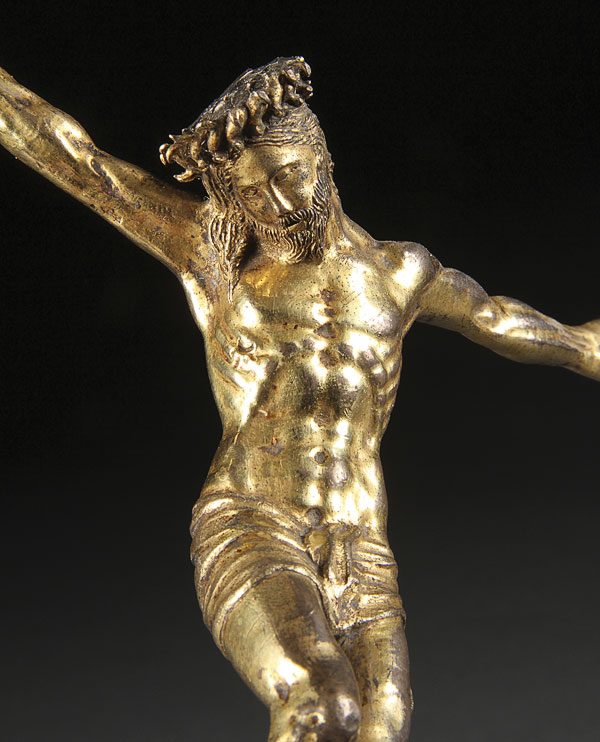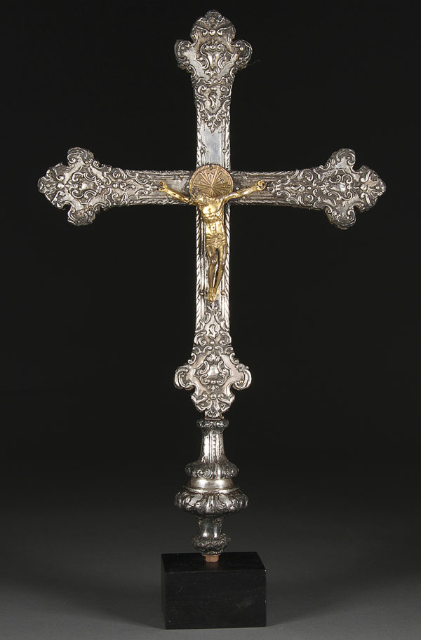 AN ITALIAN SILVER REPOUSSE PROCESSIONAL CROSS, 18TH CENTURY. The wood carcass overlaid with silver, trefoil terminals and set with an earlier, probably 16th century gilt bronze corpus (see detail at right) and mounted on an ebonized wood display stand. Height 23.5 inches (59.75 cm), excluding base.