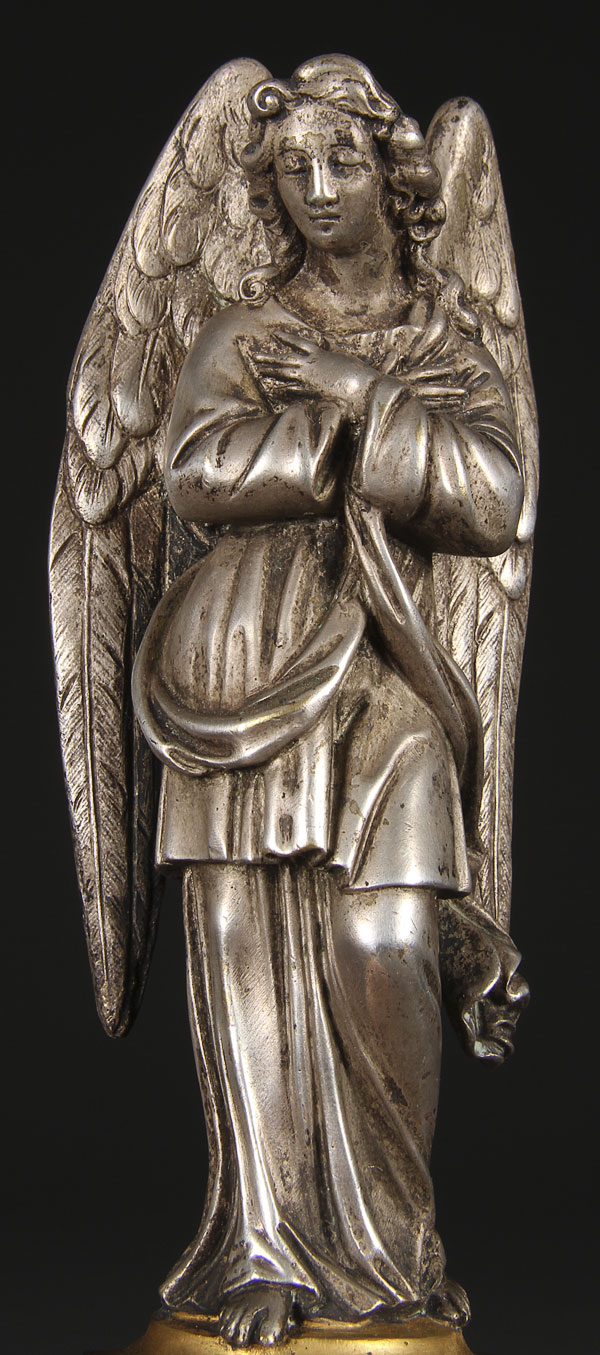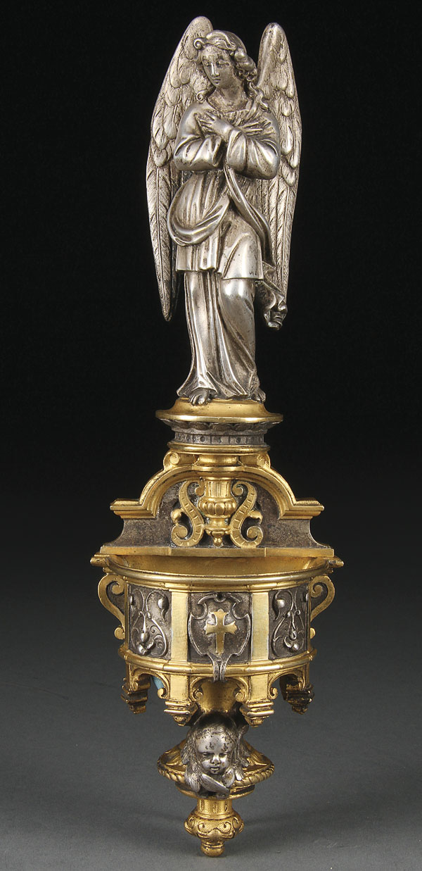 A VERY FINE FRENCH SILVERED AND GILT BRONZE ANGEL HOLY WATER FONT, 19TH CENTURY, VICTOR PAILLARD. The angel sculpted above an ornate font set with a winged cherub head. Stamped on verso VP beneath crown. Height 11 inches (28 cm).