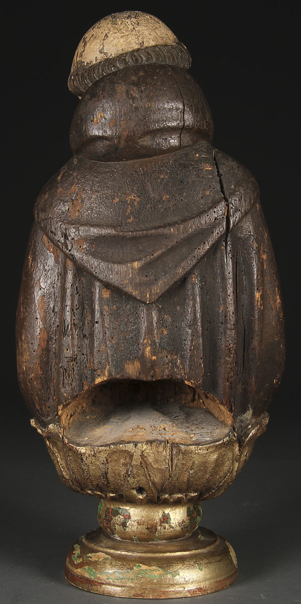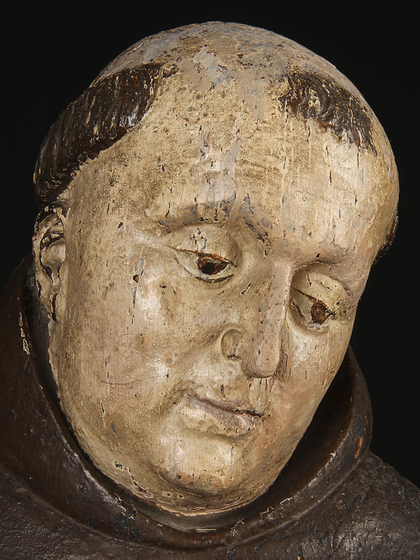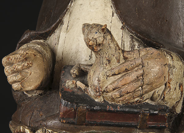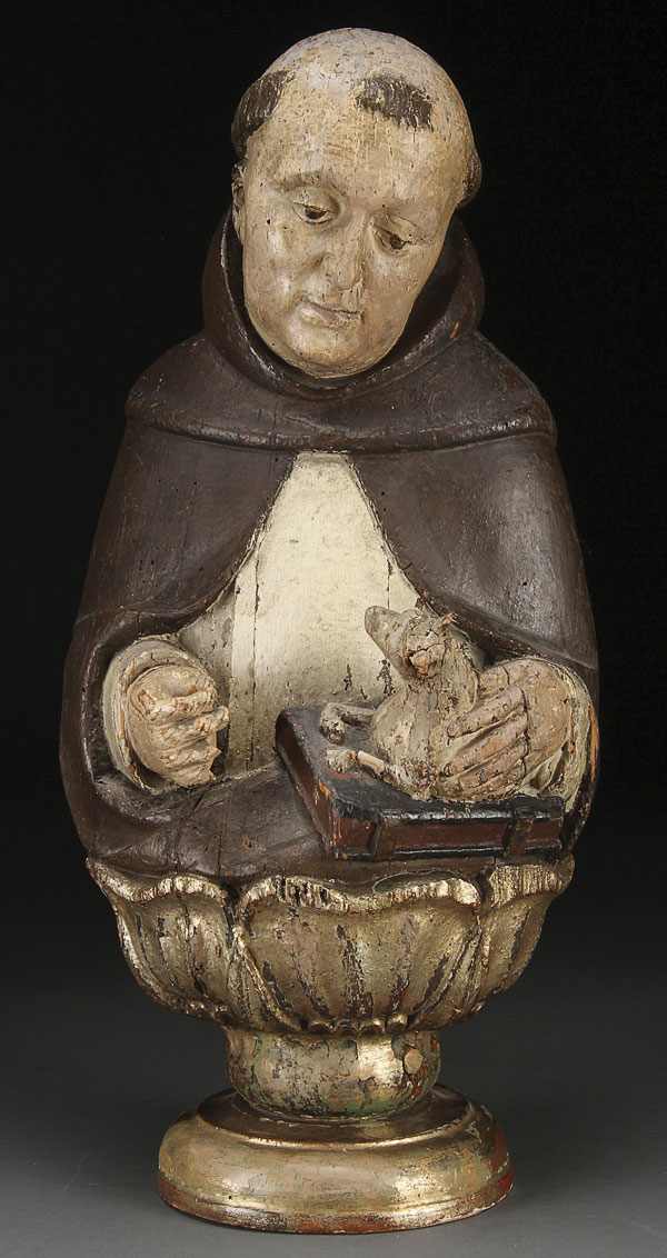 A CARVED AND POLYCHROME WOOD FIGURE OF ST. THOMAS AQUINAS, CONTINENTAL, END OF THE 17TH CENTURY. Shown holding a pen in his right hand (absent), Aquinas contemplates writing about the Eucharist, represented by the Eucharistic lamb. Height 19.75 inches (50 cm).