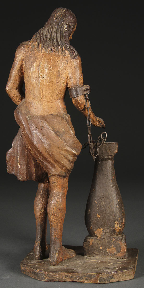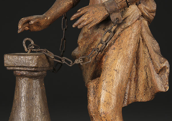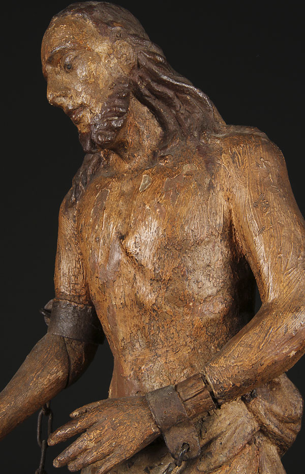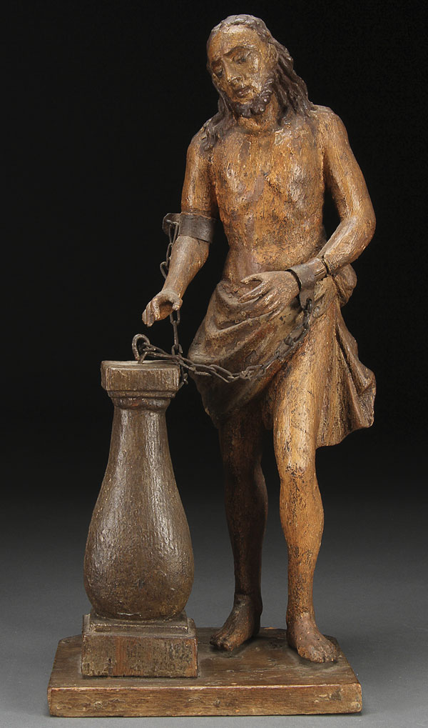 A CARVED AND POLYCHROMED WOOD FIGURE OF CHRIST AT THE PILLAR, CONTINENTAL, 18TH CENTURY Carved in full round, of good proportions and with metal hardware. Height 17.25 inches (43.75 cm).