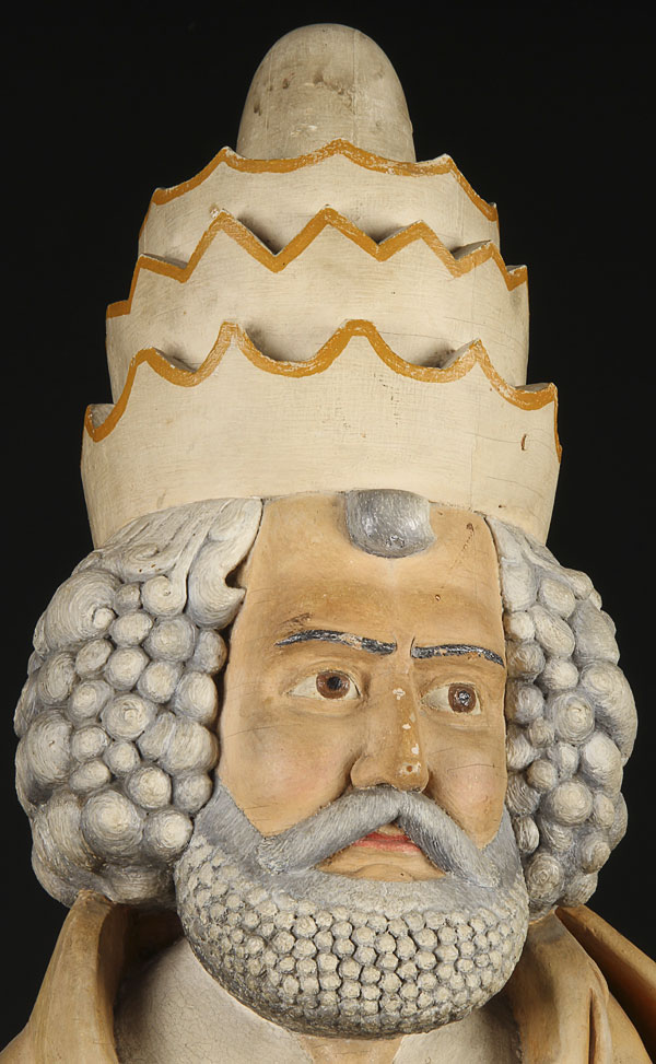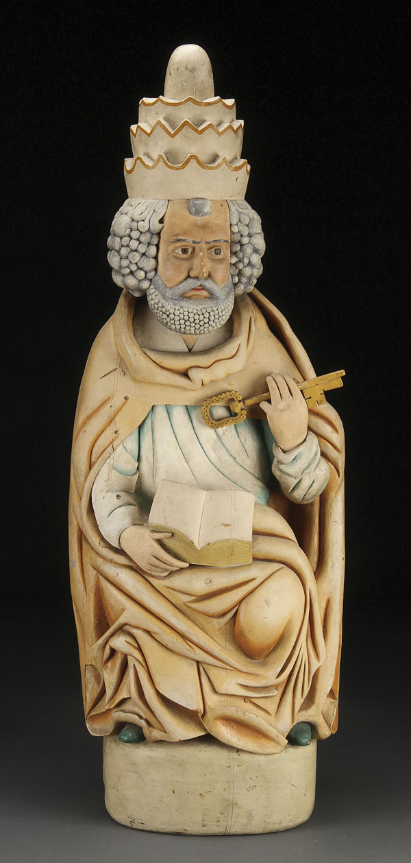 A CARVED AND POLYCHROME FIGURE OF ST. PETER, SOUTH GERMAN, 18TH CENTURY. Carved in full round with deep folds and interestingly carved hair and beard, holding the key to the kingdom and wearing a papal tiara. Height 33.5 inches (85 cm).
