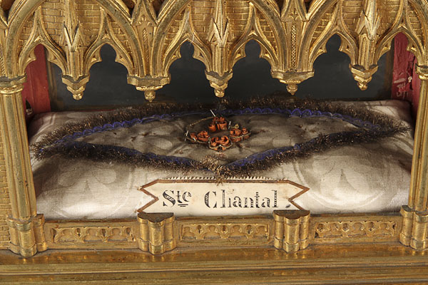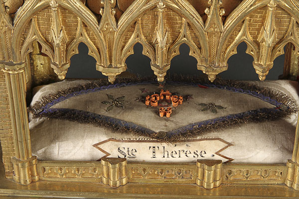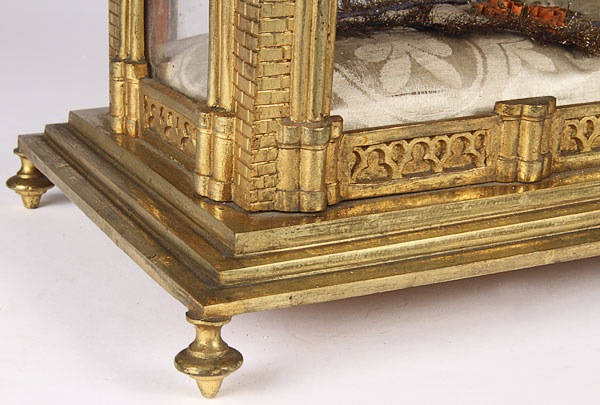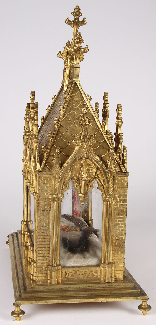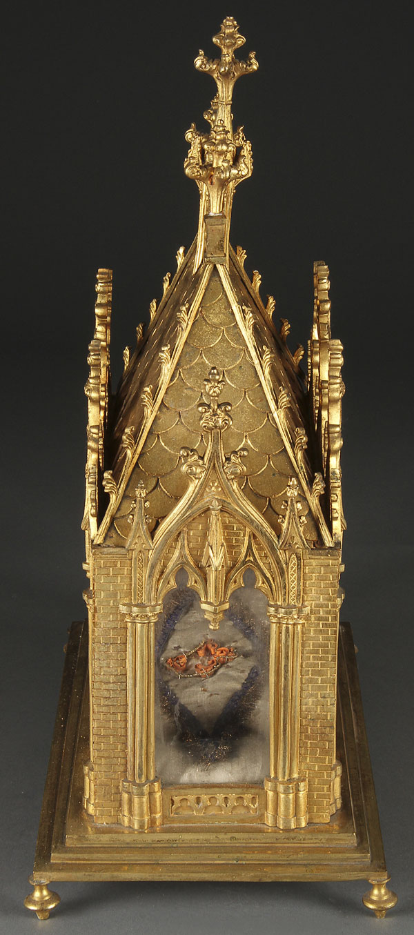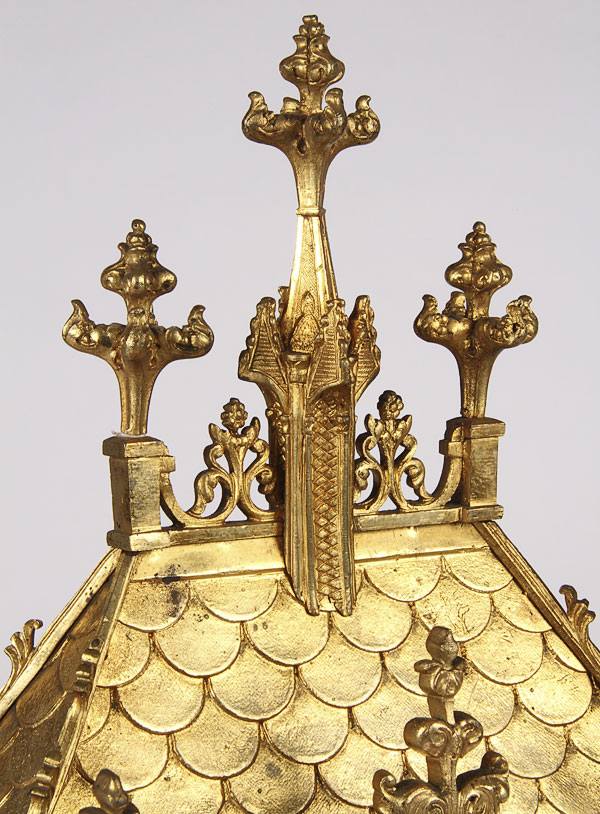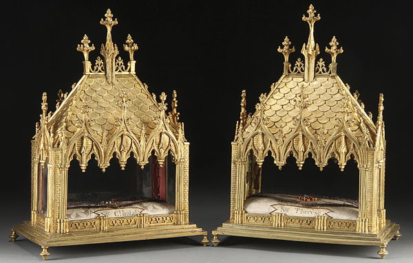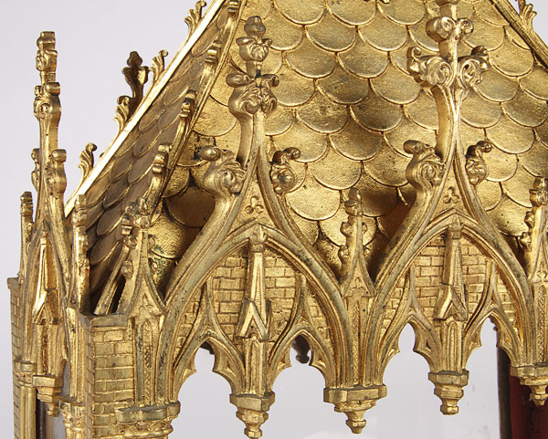 A PAIR OF MASSIVE GILT BRONZE MATCHING GOTHIC STYLE RELIQUARIES, FRENCH, 19TH CENTURY. Configured as Gothic style cathedrals, resting on raised feet, the sides opened beneath Gothic spires, the roof incised with fish scales and surmounted with three spires. Height 20.75 inches (52.5 cm), width 15.25 inches (39 cm), depth 9 inches (23 cm). Empty.
