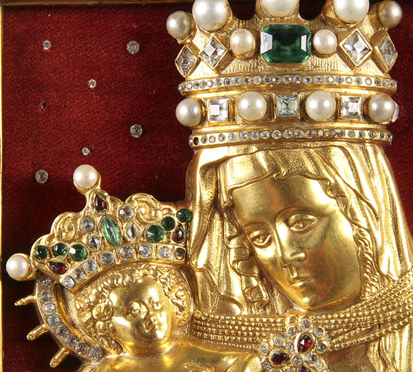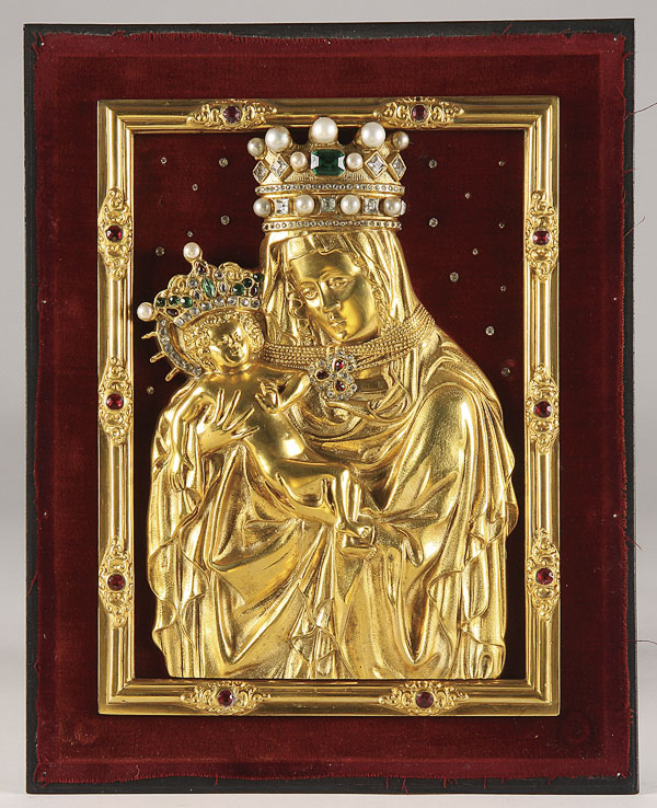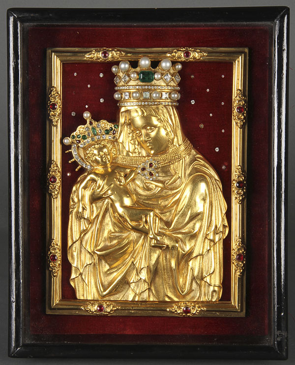 A VERY FINE GILT BRONZE PLAQUE OF THE VIRGIN AND CHILD, 19TH CENTURY, PROBABLY AUSTRIAN. Finely sculpted in high relief, both figures with paste stone encrusted crowns and faux pearls, mounted on velvet, set with rhinestone stars within a gilt frame embellished with red paste stones and contained in a glazed shadow box frame. Height 10.75 inches (27.25 cm), width 8.5 inches (21.5 cm).