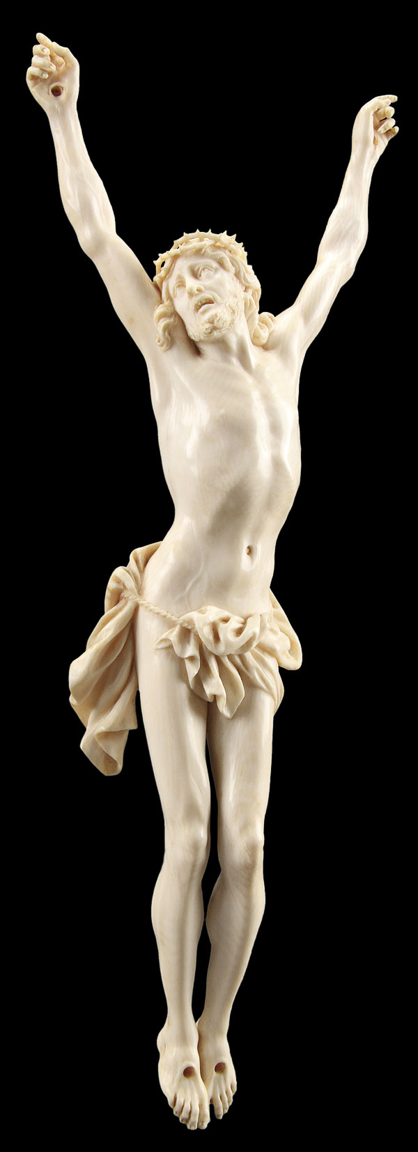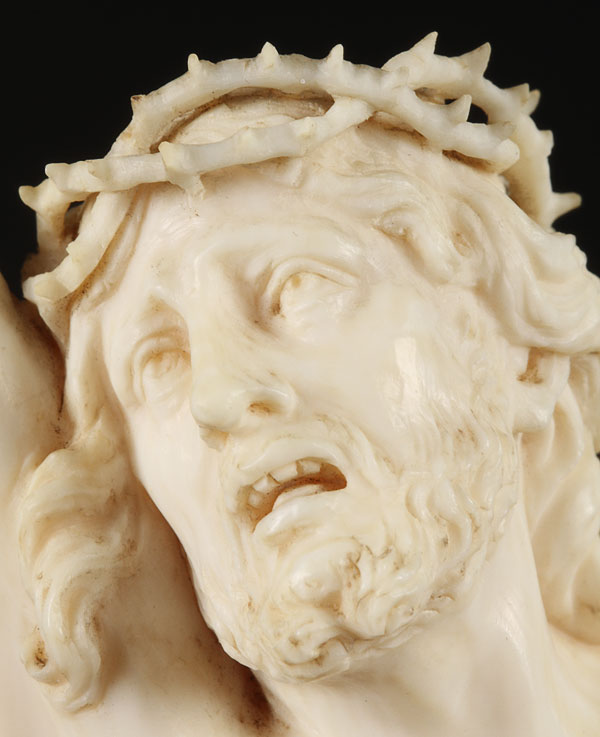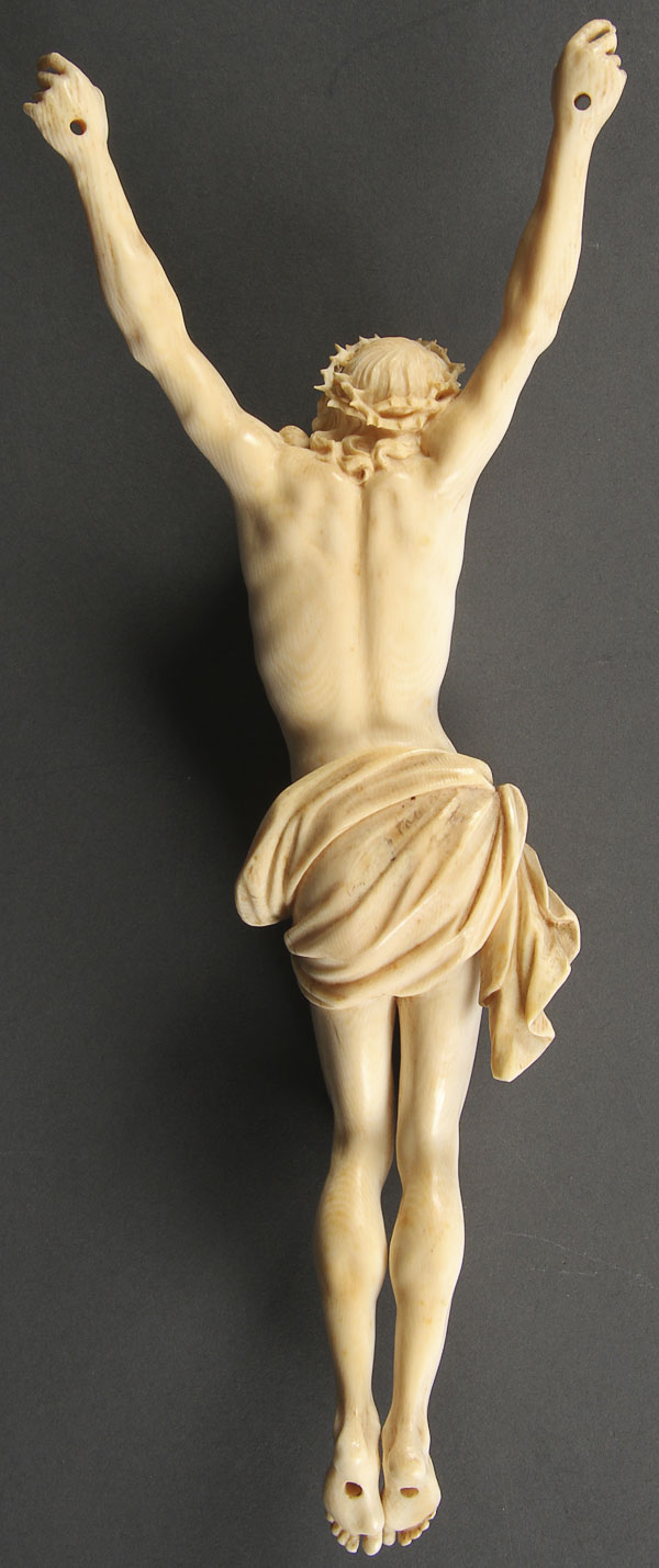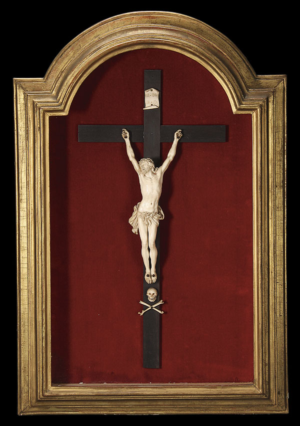 A VERY FINE CARVED IVORY CORPUS, FRENCH, 18TH CENTURY. Exquisitely carved in full round with flowing hair, pierced crown of thorns, good anatomy, veining, and the open mouth with separately carved tongue and teeth and with finely carved rope draped perizonium with deep folds. Mounted on an ebonized wood cross within a gilt shadow box frame. Corpus height 10.75 inches (27.5 cm), frame height 28 inches (71 cm).
