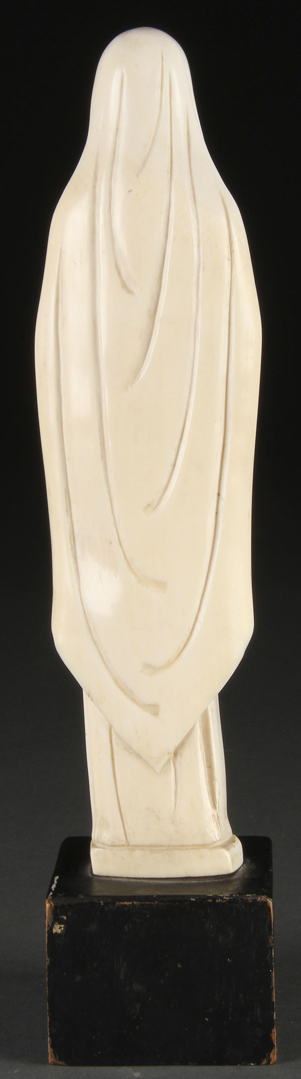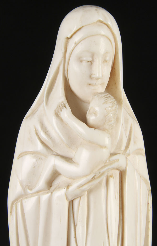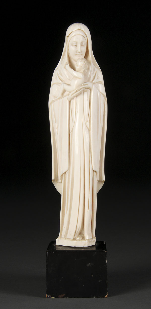 A CARVED IVORY FIGURE OF THE VIRGIN AND CHILD, PROBABLY FRENCH, 19TH CENTURY. Carved in full round and mounted on an ebony block pedestal. Ivory height 8.1 inches (20.5 cm).