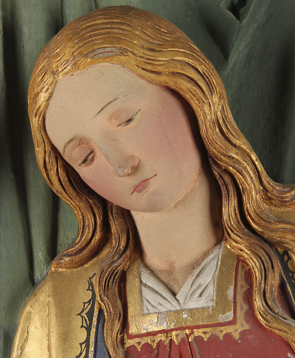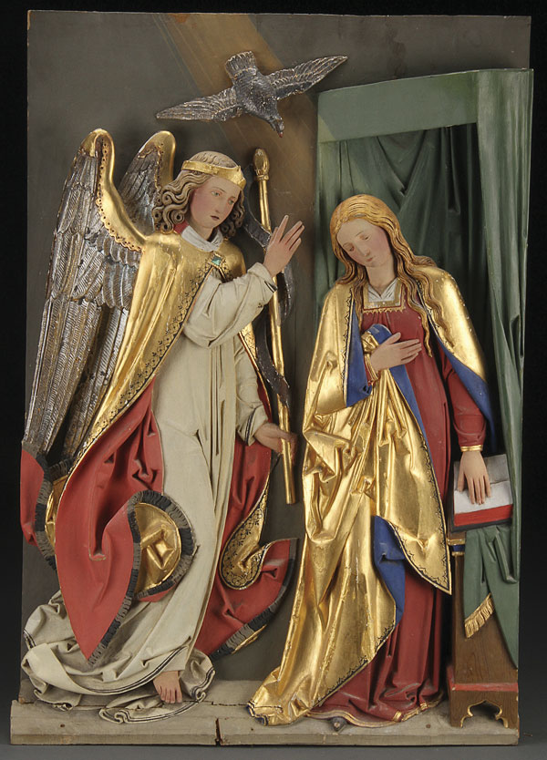 A VERY FINE POLYCHROME, GILT AND CARVED RELIEF WOOD PLAQUE OF THE ANNUNCIATION, GERMAN 19TH CENTURY. Finely carved in high relief in the Neo Gothic taste. On the left, the Archangel Gabriel announces to the Virgin that she will bear the Messiah by the power of the Holy Spirit, which is represented as a dove descending upon her. Height 29 inches (73.75 cm), width 20.25 inches (51.5 cm).