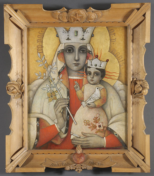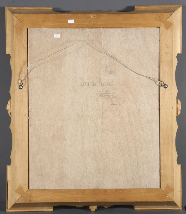 26.5 inches x 21.5 inches (67.4 x 55 cm). Contained in a custom made carved and tinted fruitwood frame with attributes of the Virgin including the Immaculate heart at the base and inscribed in Latin, Regina Pacis.