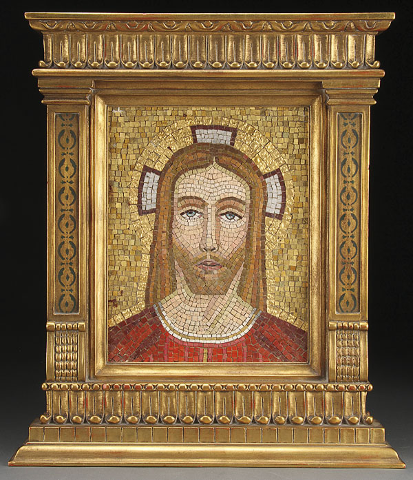 A VERY FINE MOSAIC OF CHRIST, ITALIAN, 20TH CENTURY. Contained in an attractive carved and gilt wood frame. Mosaic 13.5 inches x 10.5 inches (34 x 26.5 cm), overall height including frame 21.6 inches (55 cm).