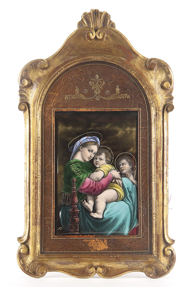 A FRAMED LIMOGES ENAMEL PLAQUE OF THE MADONNA DELLA SEDIA, 19TH CENTURY. Finely enameled and initialed A.D. lower left. Contained in a carved gilt frame with gilt impressed leather liner. Plaque size 6.75 inches x 4.5 inches (17.1 x 11.4 cm), overall size 14 inches (35.5).