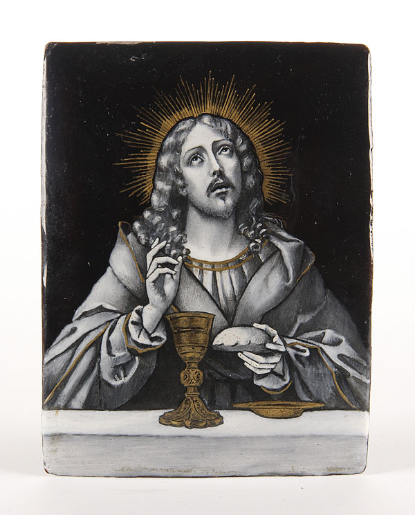 A LIMOGES ENAMELED PLAQUE OF CHRIST AT THE LAST SUPPER, 19TH CENTURY. Finely executed in grisaille with gilt highlights. 5 inches x 4 inches (12.7 x 10.2 cm).