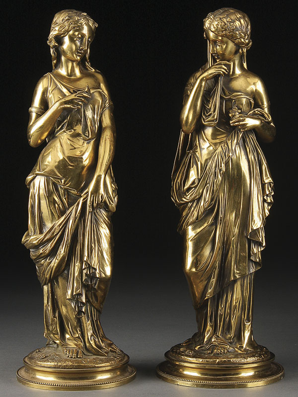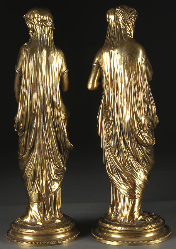A PAIR OF FRENCH 19TH CENTURY GILT BRONZE FIGURES, REPRESENTING THE FATES. Height 16 inches (40.7 cm).