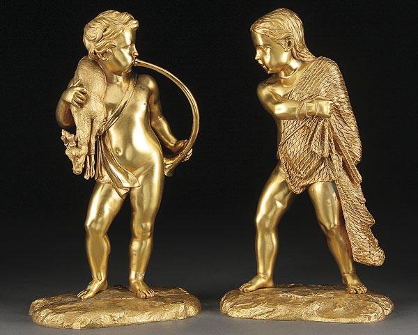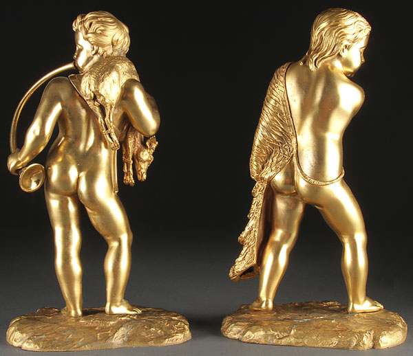 A PAIR OF GILT BRONZE FIGURES. Modeled as a putto with game and horn and as a putto casting a fishing net. Height 15.5 inches (39.5 cm).