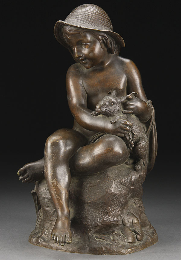 A BRONZE FIGURE OF A BOY HOLDING A RABBIT, 19TH CENTURY, PROBABLY FRENCH. Dark brown patina, inscribed on base with conjoined monogram JK. Height 14.25 inches (36.2 cm).