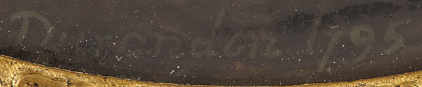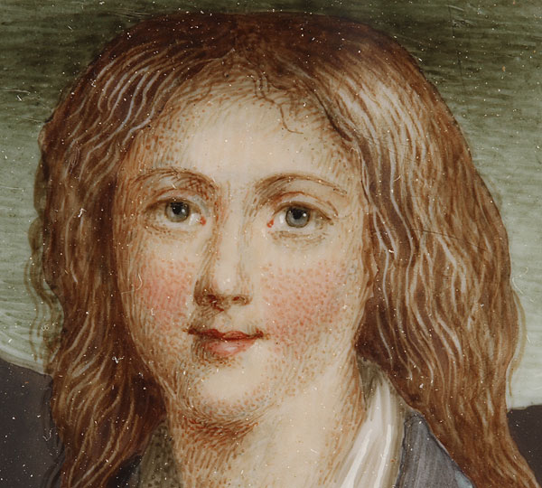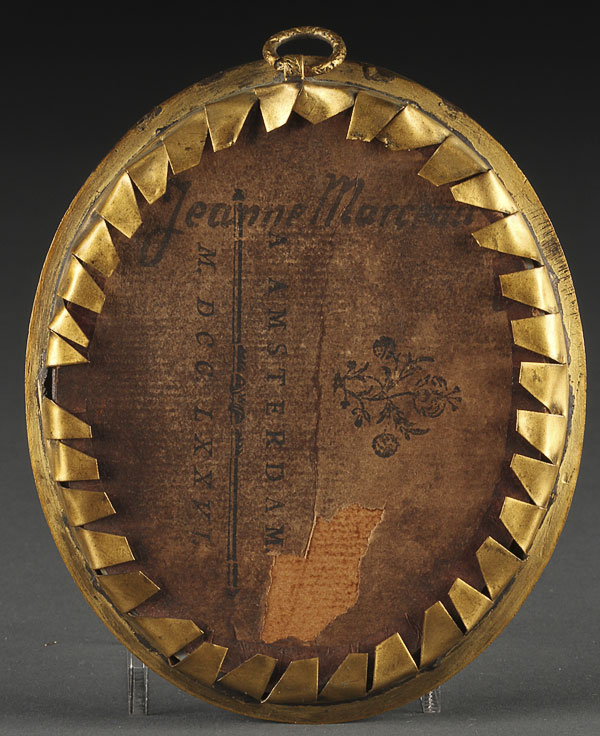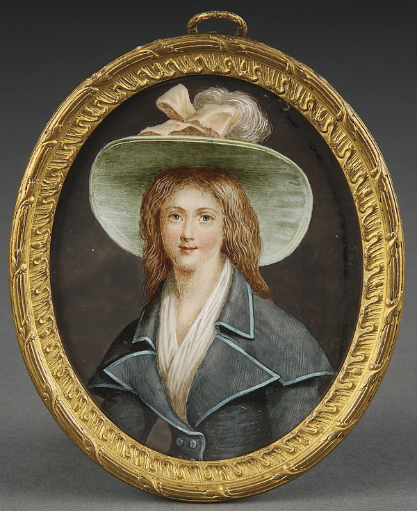 A PORTRAIT MINIATURE OF A YOUNG GIRL IN PLUMED HAT ON IVORY. Signed Durandon and dated 1795. Contained in a glazed gilt metal frame, verso inscribed Jeanne Marceau. Height 3.6 inches (9.5 cm) excluding frame.
