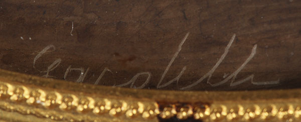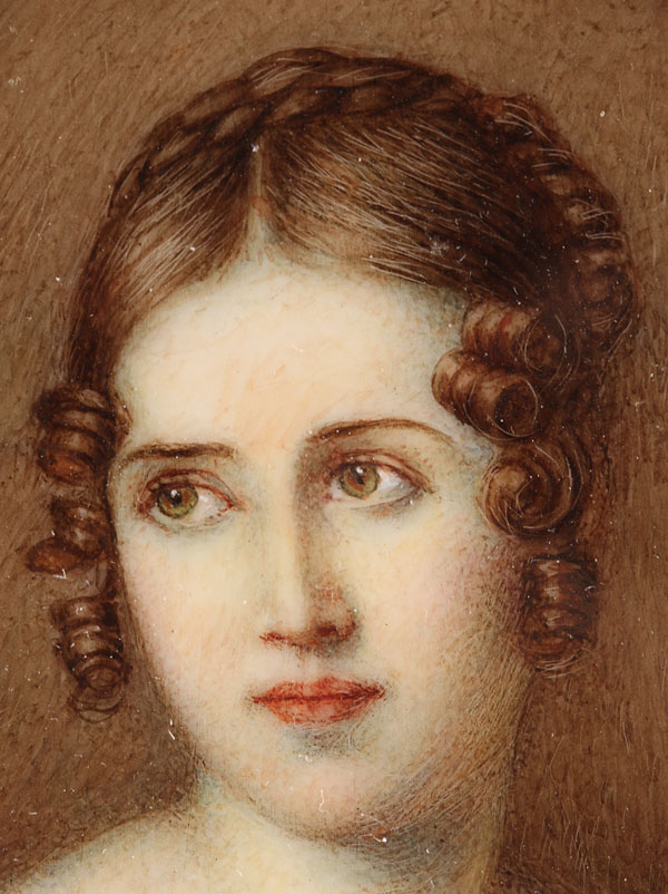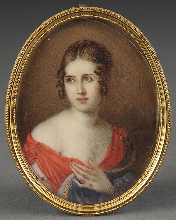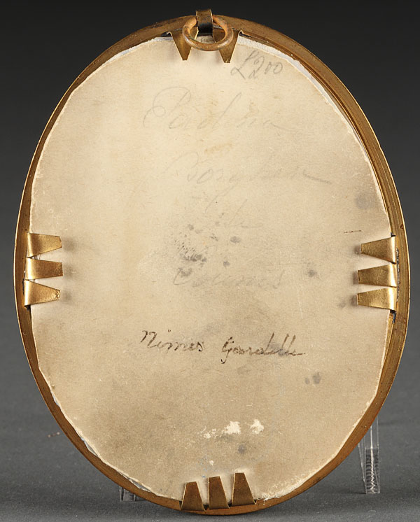 A PORTRAIT MINIATURE OF PAOLINA BORGHESE ON IVORY. Inscribed lower left Gardelli and on verso Nimes Gardelli. Contained in a glazed gilt metal frame. Height 3.5 inches (9 cm) excluding frame.