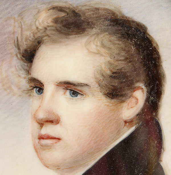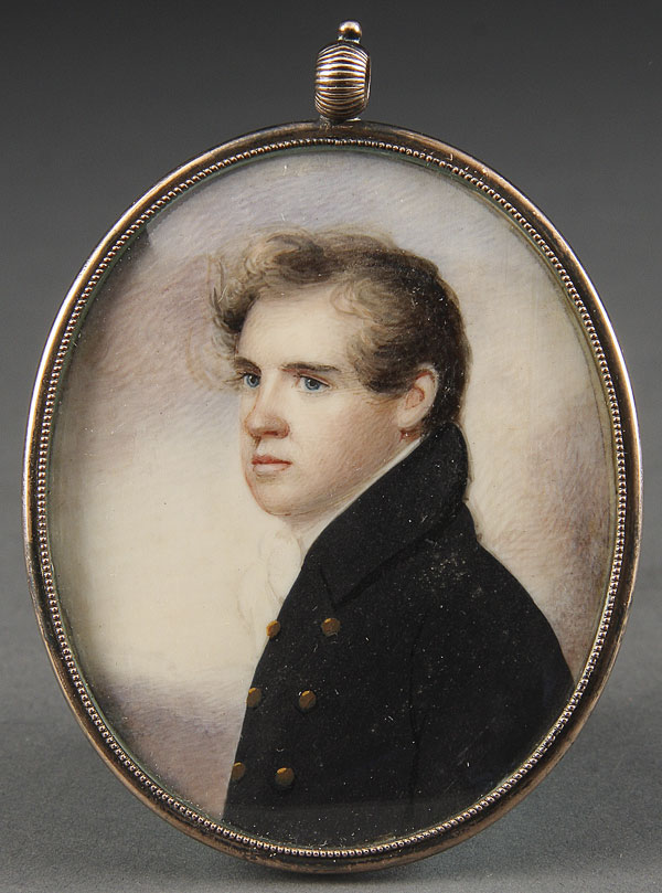 A PORTRAIT MINIATURE OF ROBERT A BARTOW, CIRCA 1822. Contained in a gilt oval frame with integral suspension loop and verso with exposition window revealing a woven relic, presumably of the sitter's hair. Inscribed "Robert A. Bartow, Obt. 15 November, 1822 Aetat 26 years, 8 months, 3 days". Height 2.75 inches (7 cm).