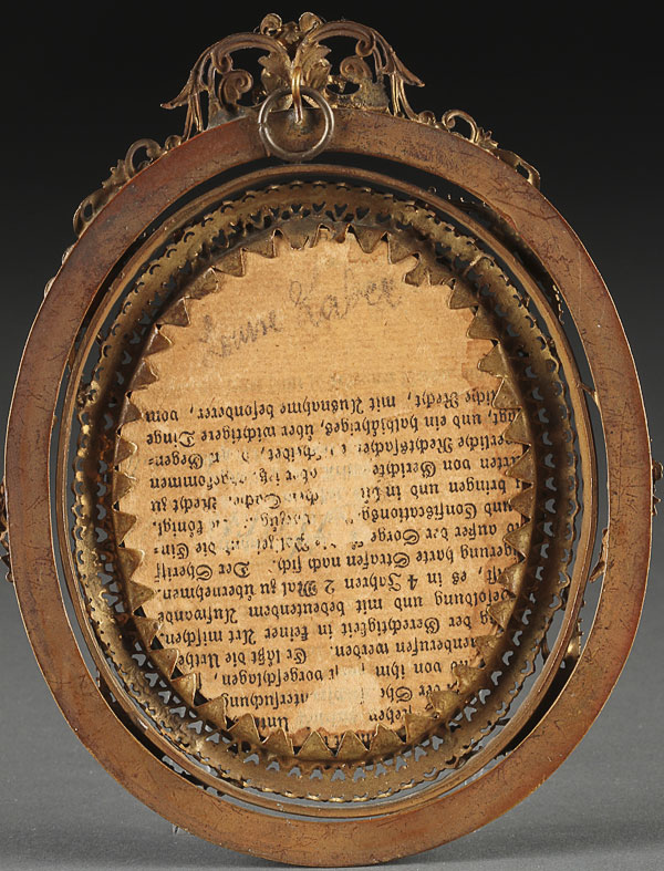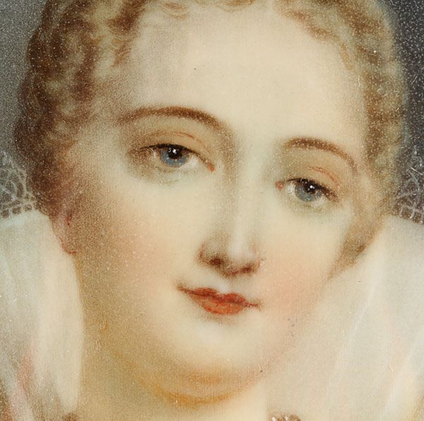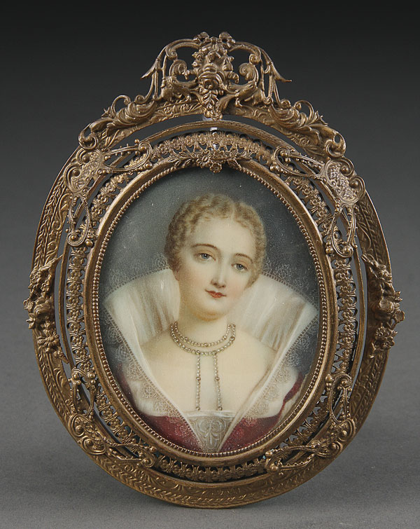 A PORTRAIT MINIATURE OF A WOMAN WITH LACE COLLAR AND PEARL NECKLACE, Contained in an ornate glazed oval metal frame. Overall height 5.5 inches (14 cm).