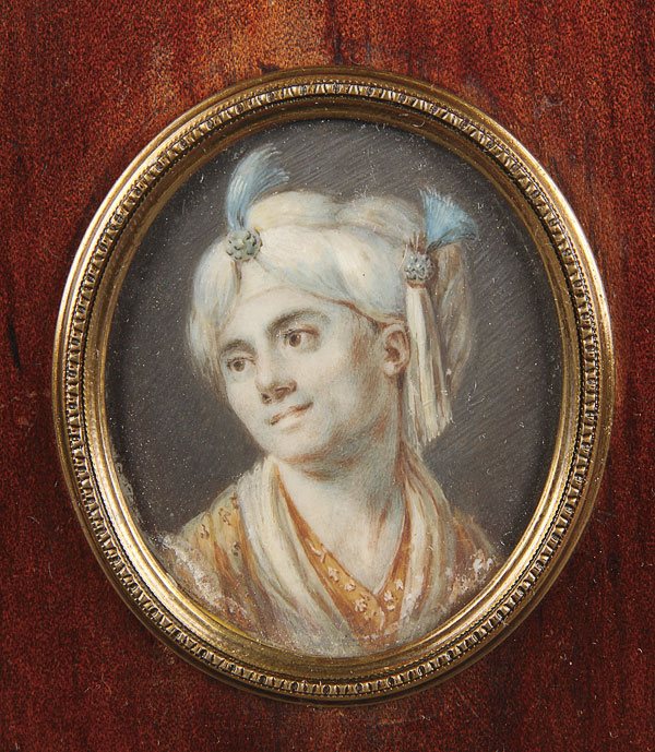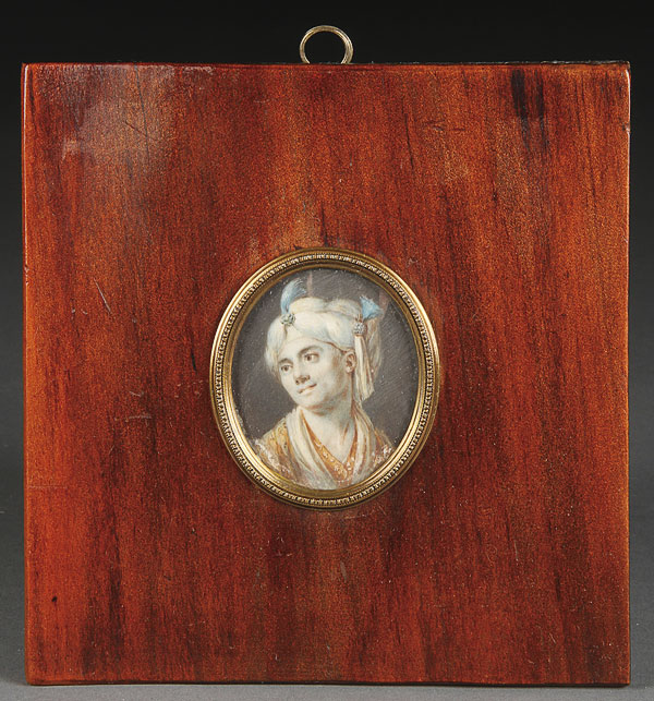 A PAIR OF PORTRAIT MINIATURES, Including a man wearing a plumed turban and embroidered cloak, 19th century. In a gilded metal frame set into a larger wood frame. Painting height 2.2 inches (5.5 cm). Together with a portrait of Frederick the Great, 19th century, indistinguishably signed. Painting 3 inches (8 cm).