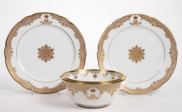 A PAIR OF IMPERIAL RUSSIAN PORCELAIN DINNER PLATES FROM THE BANQUET SERVICE OF TSAREVICH ALEXANDER ALEXANDROVICH (LATER TSAR ALEXANDER III), IMPERIAL PORCELAIN FACTORY, CIRCA 1888. The cavetto with gilt and red medallion, the scalloped rim decorated with an elaborate border also in red and gold and surmounted by his double “A” cipher beneath the Imperial crown and together with a large matching serving bowl. Underside of each with mark of Alexander II & III. Plate 9.75 inches (25 cm) in diameter, the serving bowl 7.5 inches (19 cm) in diameter.