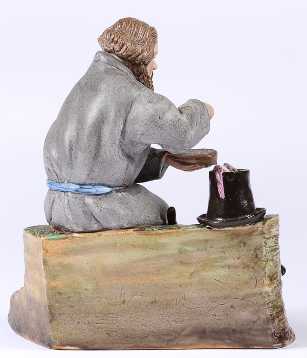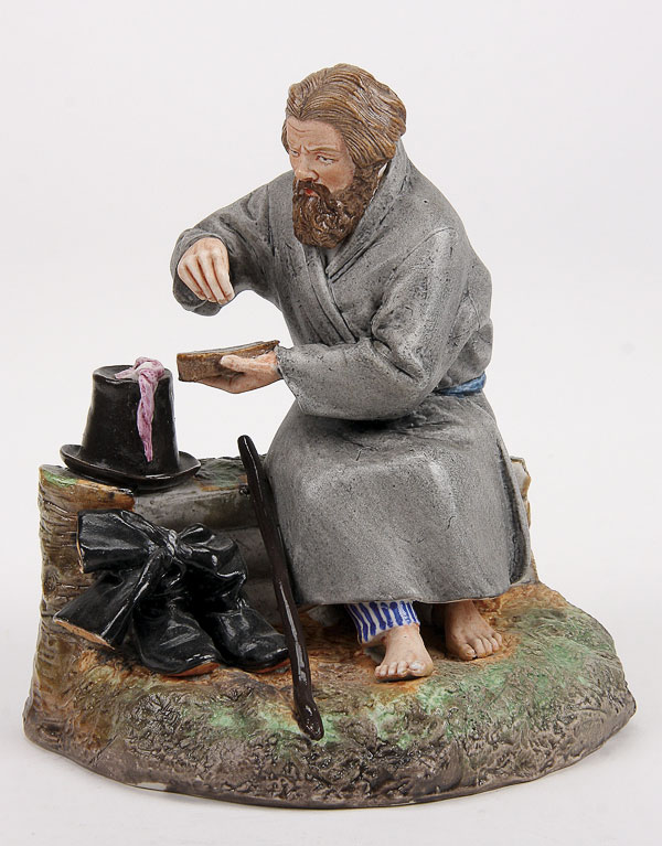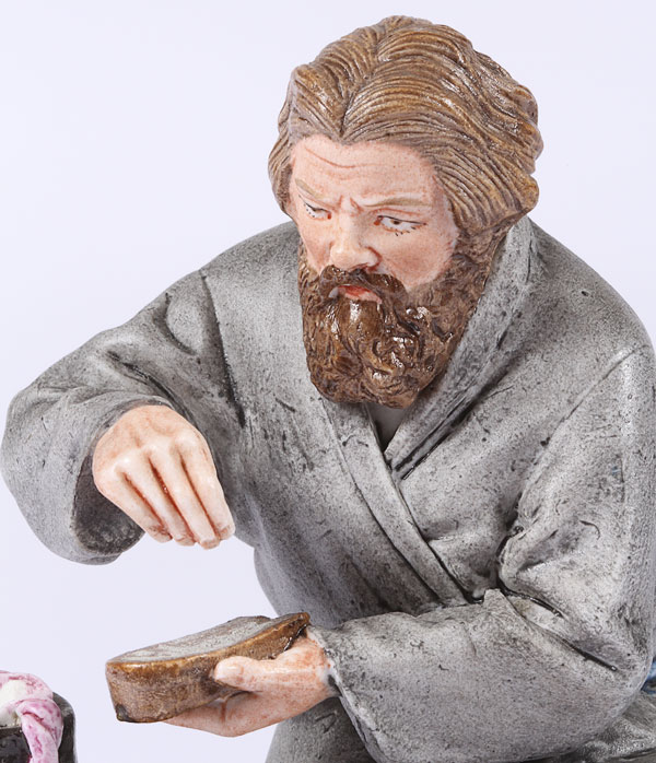 A RUSSIAN BISQUE PORCELAIN FIGURE OF A PEASANT SALTING HIS BREAD, INCISED POPOV MARK. Height 5.5 inches (13.9 cm).