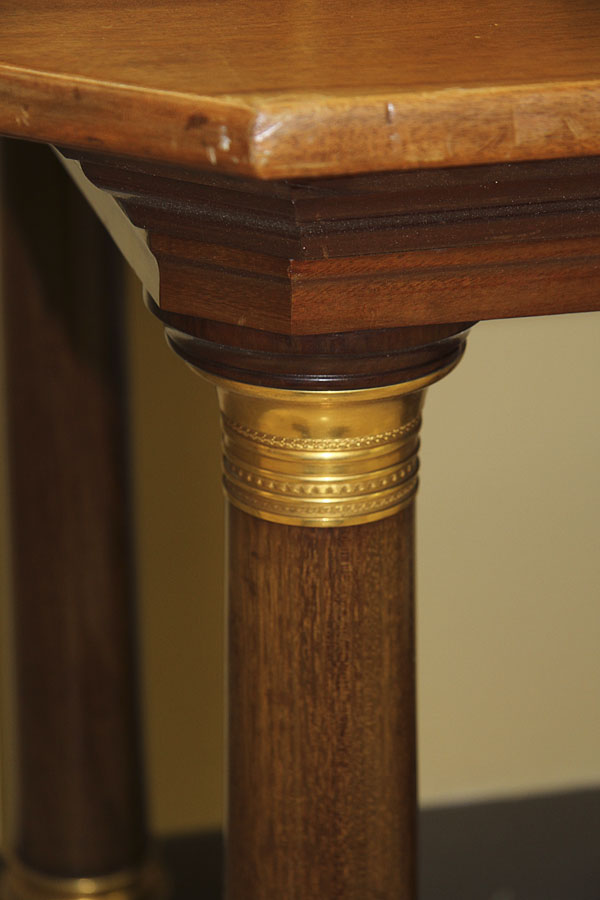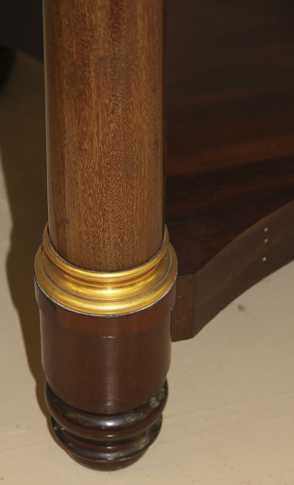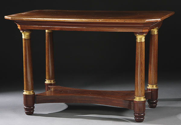 AN EMPIRE GILT BRONZE MOUNTED MAHOGANY CONSOLE TABLE, EARLY 19TH CENTURY. POSSIBLY RUSSIAN. The rectangular top above a diminishing molded skirt raised on tapering columnar legs, each end terminating with a gilt bronze mount and joined by a symmetrical wasted stretcher. Length 47.5 inches (120.5 cm), width 30 inches (76 cm), height 30.75 inches (78 cm).