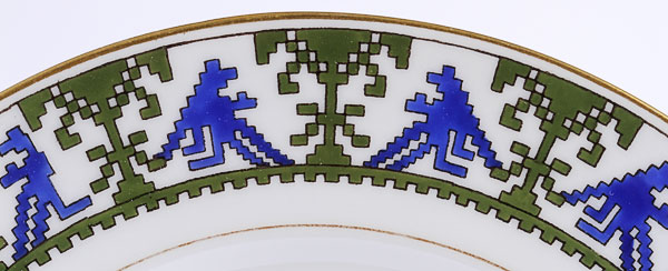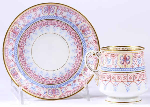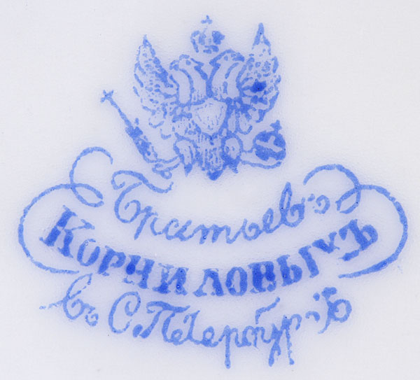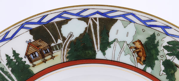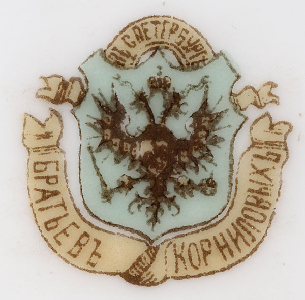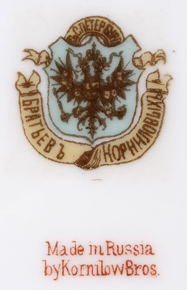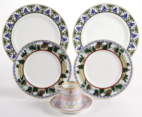 FOUR RUSSIAN PORCELAIN PLATES, KORNILOV, CIRCA 1890-1900. Comprising two matching diner plates with faux embroidered pattern on border and gilt banding, diameter 9.5 inches (24.2 cm), together with a pair of matching desert plates with Russian Fairy Tale inspired border decoration and gilded rims, diameter 8 inches (20.4 cm). The underside of each plate with factory mark of Kornilov beneath the Imperial Warrant and the latter two in English, “Made in Russia by Kornilov Bros.” Kornilov Brothers, St. Petersburg, circa 1850. Together with a porcelain cup and saucer, Beehive pattern, from the “Catherine” service. Cup diameter 2 3/8 inches, saucer diameter 5.5 inches (14 cm).