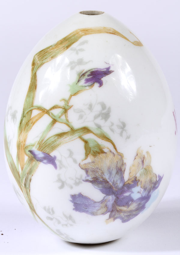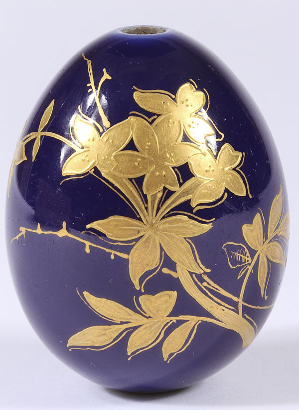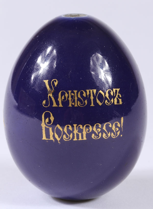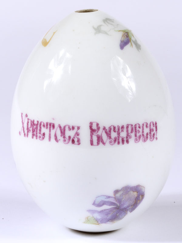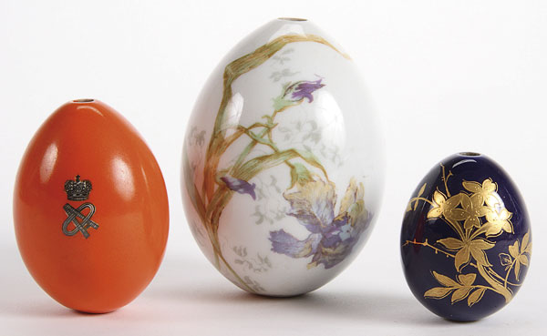 THREE RUSSIAN PORCELAIN EASTER EGGS, CIRCA 1900. Comprising an orange egg with the transfer cipher O.A. for Olga Alexandrovna (sister of Tsar Nicholas II), height 3 inches (7.5 cm); the second decorated with irises and the verso emblazoned with the traditional Easter greeting in Cyrillic "KHRISTOS VOSKRESE!", height 4.1 inches (10.5 cm); and a cobalt blue egg with gilt floral decorations and also inscribed with the Cyrillic Easter greeting, 2.4 inches (6 cm).