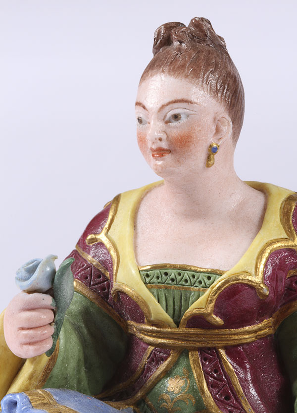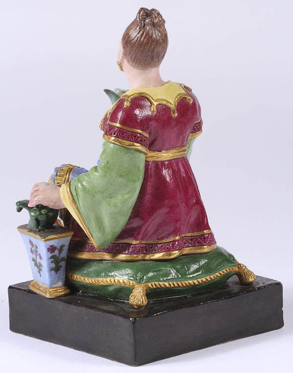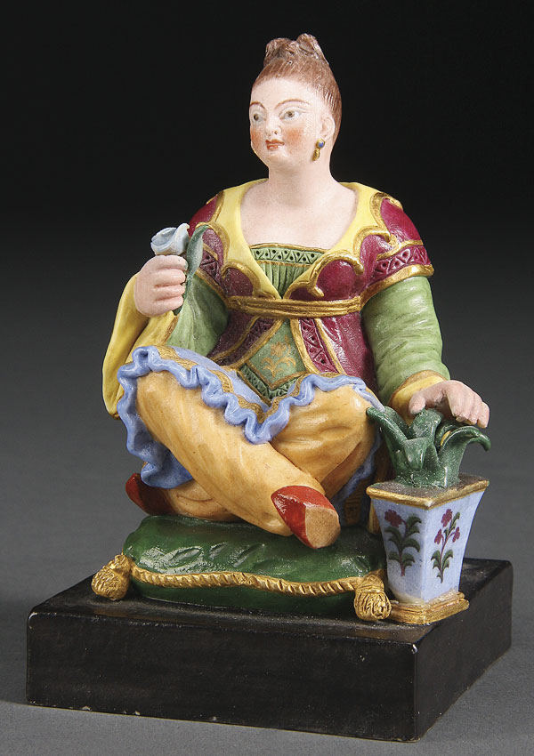 A FINE BISQUE PORCELAIN FIGURE OF A SEATED WOMAN, CIRCA 1840, POSSIBLY RUSSIAN OR FRENCH FOR THE RUSSIAN MARKET. Seated on a green velvet pillow and dressed in Persian attire and holding a flower. Underside of base with indistinguishable incised single letter mark. Height 4.5 inches (11.5 cm).
