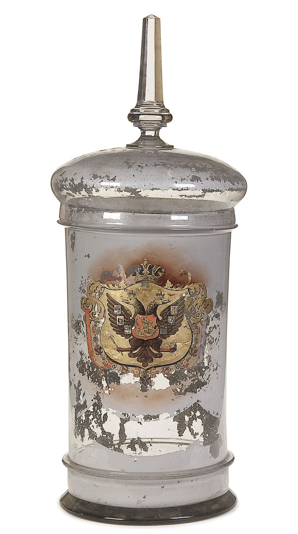 A LARGE AND IMPRESSIVE IMPERIAL RUSSIAN PERIOD GLASS APOTHECARY JAR, CIRCA 1875. Resting on a slightly flared foot with domed lid set with a prism finial and the interior with gilt Imperial double headed eagle encircled with the Order of St. Andrew. Height 34 inches (86.4 cm).