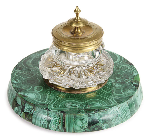 A RUSSIAN MALACHITE GILT BRONZE MOUNTED CRYSTAL INK STAND, 19TH CENTURY. The circular base resting on three ball feet and veneered in malachite with circular gilt bronze reservoir holding a floral form crystal ink well with gilt bronze over fitting lid. Diameter 7.6 inches (19.5 cm), height 6 inches (15.2 cm).