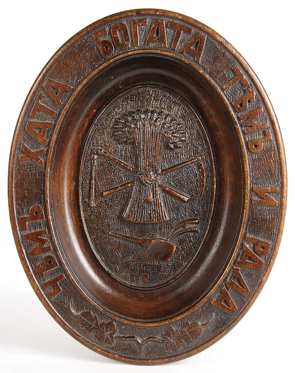 A CARVED RUSSIAN BREAD PLATE, 19TH CENTURY. The central reserve carved with wheat, scythe and plow and the borders carved with the Russian proverb "Whatever your house has, be joyful." Length 11.75 inches (30 cm).