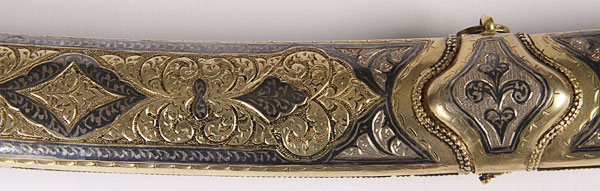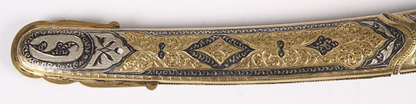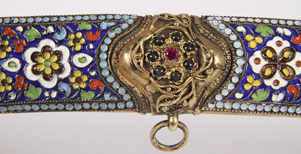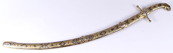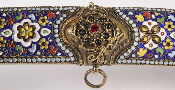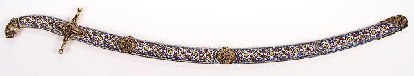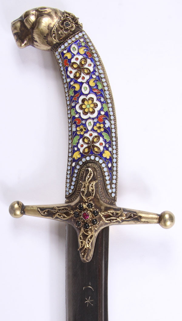 A FINE RUSSIAN SILVER-GILT NIELLOED AND CLOISONNÉ ENAMELED COSSACK STYLE SHASHKA, SOVIET PERIOD. The curved handle with panther head pommel, filigree collar, set with seed pearl atop a cloisonné enameled grip on one side and a silver-gilt nielloed engraved handle on opposite side. The scabbard set with ornate suspension bands in filigree on one side and niello on the opposite side, and one side of the scabbard ornately decorated in cloisonné enamel with filigree and gem-set drag, the opposite side in silver-gilt and engraved niello work. The cross guard also filigreed and set with paste stones. Containing a double( or serpent tongue-forked) polished blade with indistinguishable marks. Overall length 35.5 inches (90 cm).