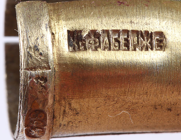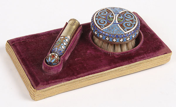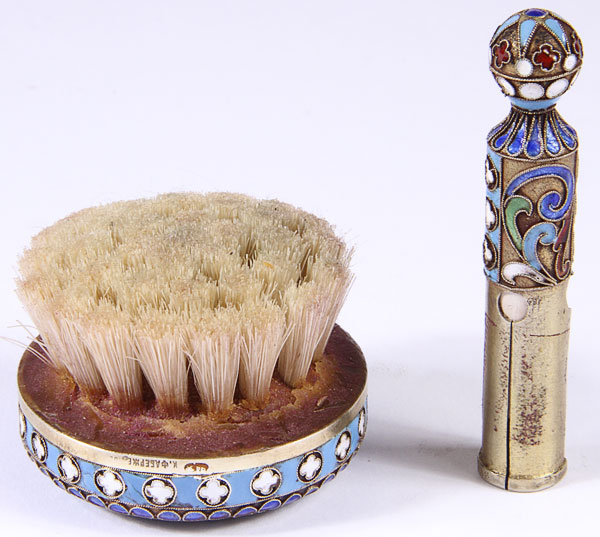 A RUSSIAN SILVER-GILT AND CLOISONNÉ CHALK HOLDER AND BRUSH, HALLMARKED MOSCOW, CIRCA 1890. Both pieces stamped in Cyrillic KFABERGE and 84 silver standard. Setting on the remnant of its original box. Greatest measurement 2.6 inches (6.5 cm).