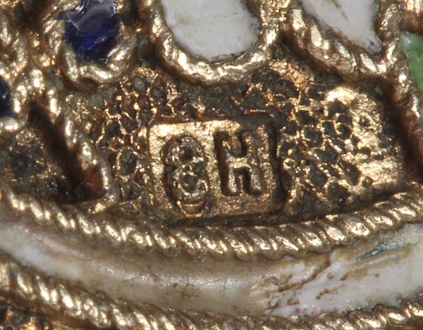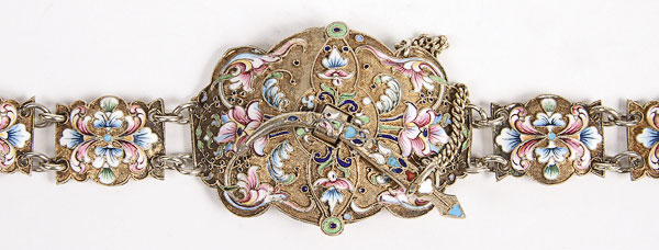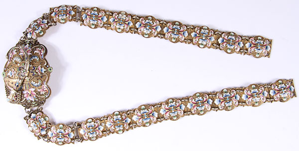 A FINE RUSSIAN SILVER-GILT AND SHADED ENAMEL LADIES BELT. Comprised of 19 shaped links with shaded enameled foliates on a stippled gilt ground and shield form buckle, similarly enameled with kindjal style latch. Hallmarked Moscow, 1908-1917 and Cyrillic maker's mark N.Z. and 84 silver standard. Overall length 26.5 inches (67.5 cm).