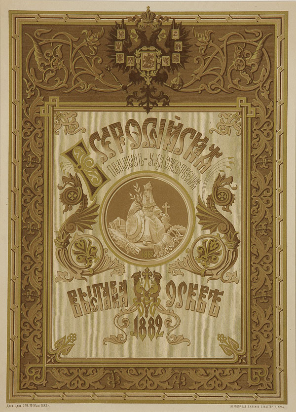 A RUSSIAN BROADSIDE FOR THE ALL-RUSSIAN INDUSTRIAL AND FINE ARTS FAIR-MOSCOW 1882. Printed in brown and gold, at center a roundel with the personification of Russia encircled by the exhibition location and date. At top center the Imperial Double Headed Eagle on an ornate strapwork border. 17 inches x 12 inches (43 x 30 cm).