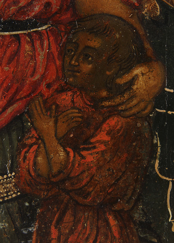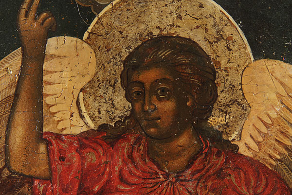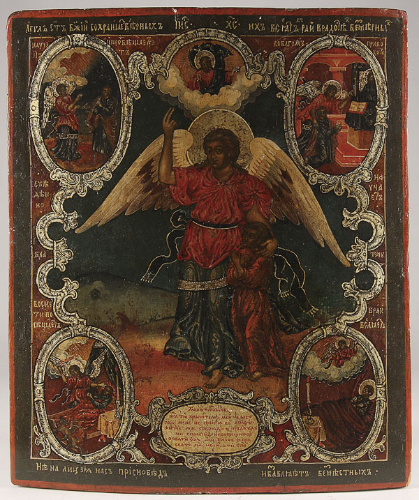 A LARGE RUSSIAN ICON OF THE GUARDIAN ANGEL, 18TH CENTURY. At center the Guardian Angel is assigned to a young child by Christ who looks on at top center. In each corner depictions with corresponding narratives on how and where the Guardian Angel protects you. At the lower central margin a cartouche inscribed with a standard prayer to the Guardian Angel, which begins "O Lord, Thou my protector, do not forsake me but always keep my life in peace, and grant me salvation..." Together with a repousse silvered metal riza needing restoration. 20.75 inches x17.8 inches (52.7 x 45.2 cm).