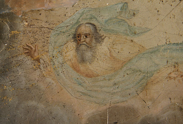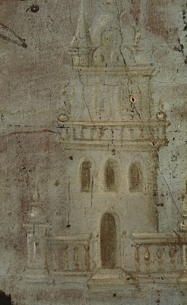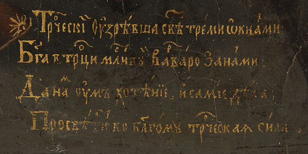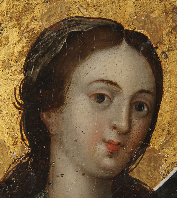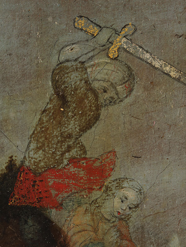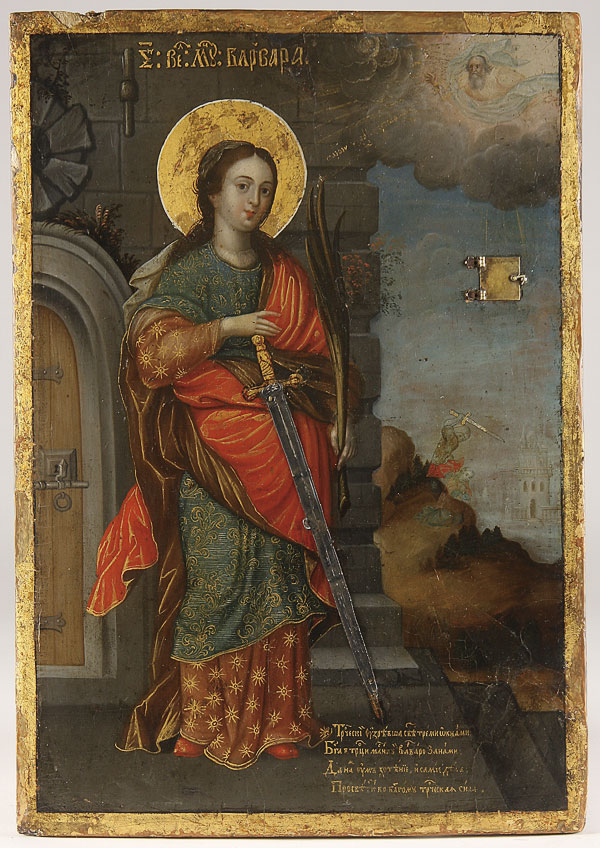 AN INTERESTING RUSSIAN ICON RELIQUARY OF ST. BARBARA, PERHAPS VELIKI USTYG, 18TH CENTURY. In this highly accomplished and painterly icon is depicted the female martyr Saint Barbara. She holds a martyrs palm and her attribute, a sword, which has an applied metal blade attached. In the top right corner God the Father calls to Barbara, rendered in a trace gilt inscription. The distant background displays a scene depicting the martyrdom of St. Barbara delicately rendered and further back still a castle more reminiscent perhaps of a Dutch or Baroque landscape. At mid upper right a hinged door opening to reveal a reserve containing a small pebble of wax wrapped in cotton. At lower right a gilt inscribed prayer relating that St. Barbara represented the Holy Trinity through the light of three windows, and asks for mercy in the enlightening of those praying in her name. 15.3 inches x10.8 inches (39.1 x 27.5 cm).