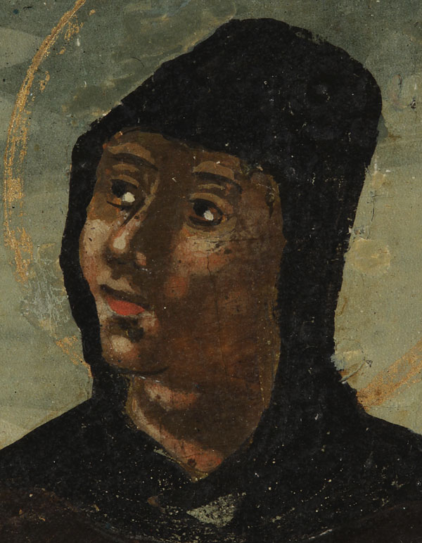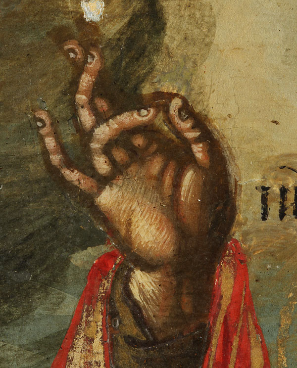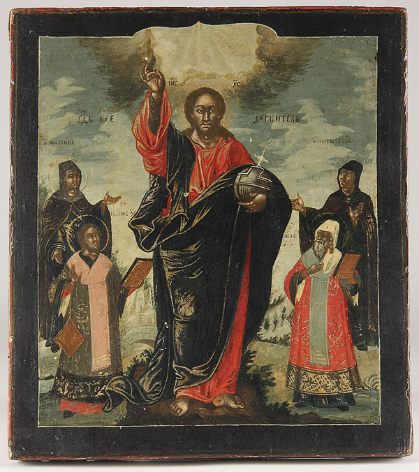 A RUSSIAN ICON OF CHRIST WITH SELECTED SAINTS, 18TH CENTURY. At center Christ, flanked by The Venerable Matrona, St. John Chrysostom, the Venerable Paraskeva and the Metropolitan Peter. 12.5 inches x 11 inches (31.7 x 28.2 cm).