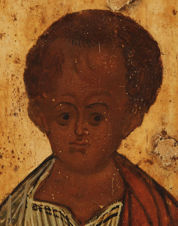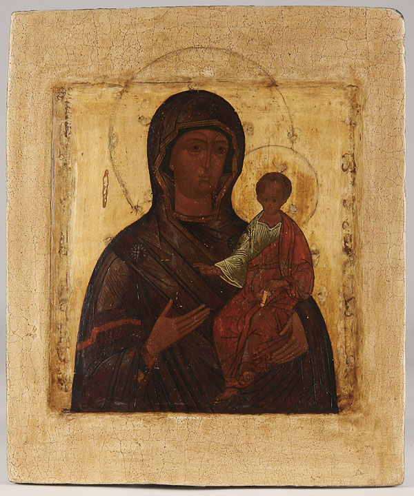 A RUSSIAN ICON OF THE SMOLENSK HODEGETRIA MOTHER OF GOD, 19TH CENTURY. Finely modeled following the traditional ancient forms. 12.25 inches x 10.25 inches (31.1 x 26 cm).