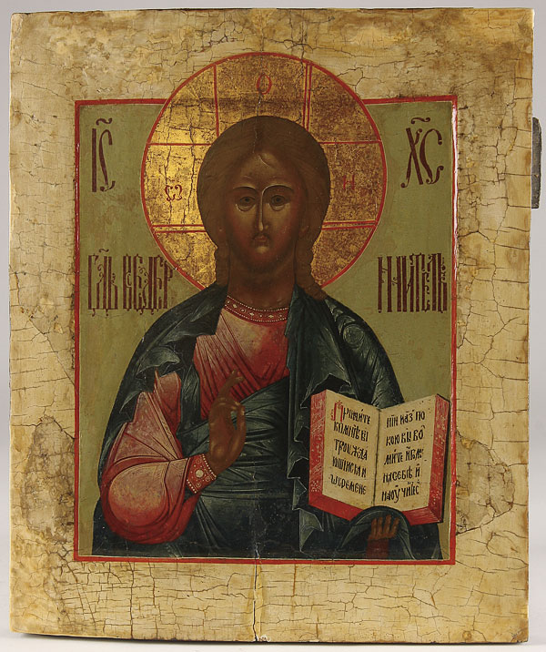 A RUSSIAN ICON OF THE LORD ALMIGHTY, 19TH CENTURY. Christ delivers a blessing and holds an open book of gospels to Matthew 11:28. Size 14 inches x 11.6 inches (35.6 x 29.5 cm)