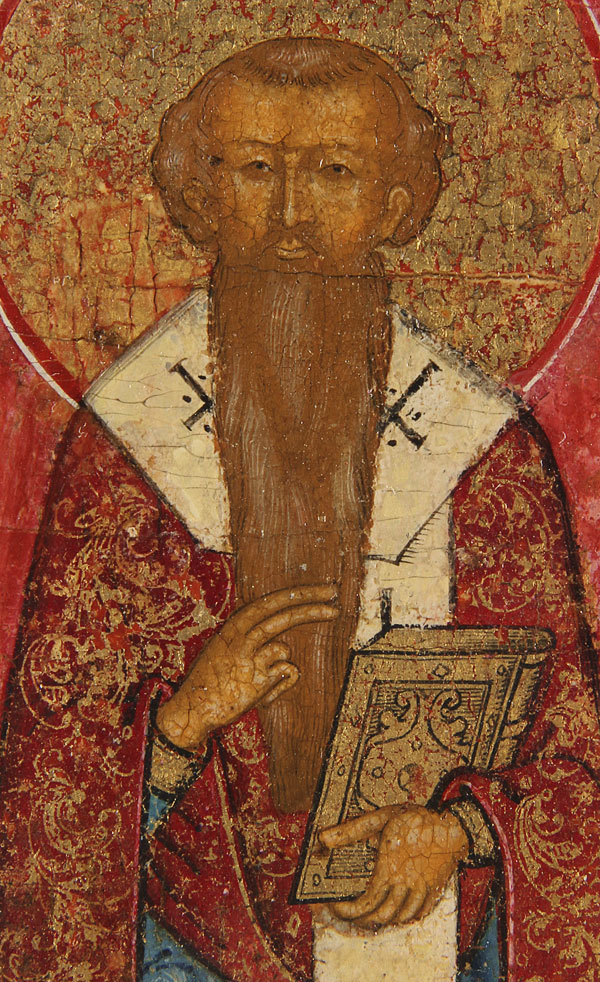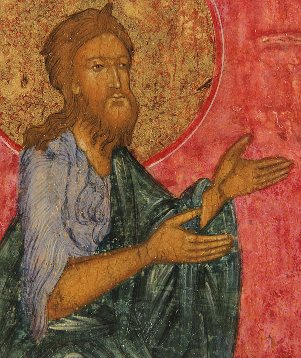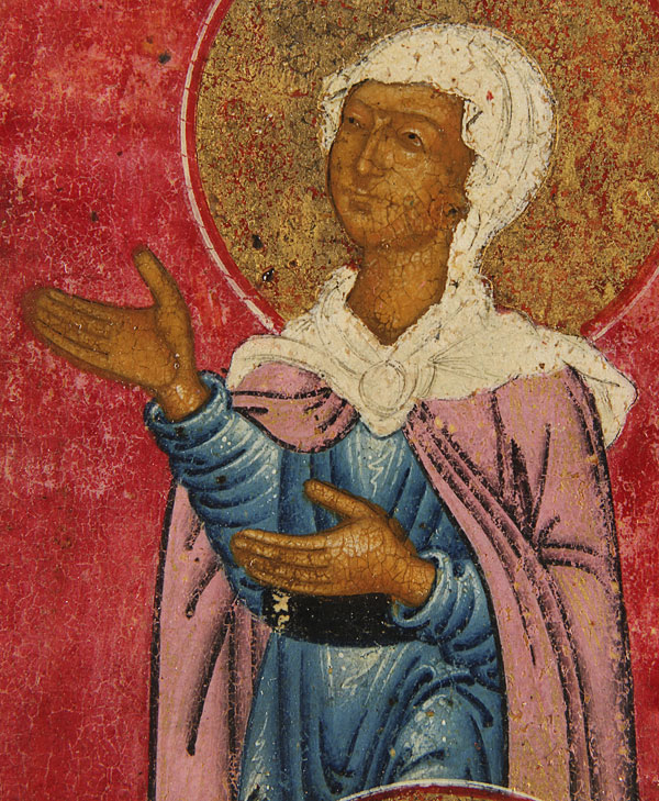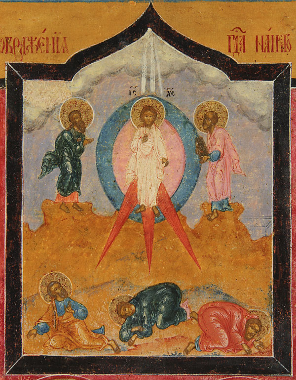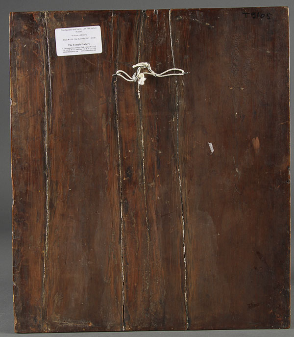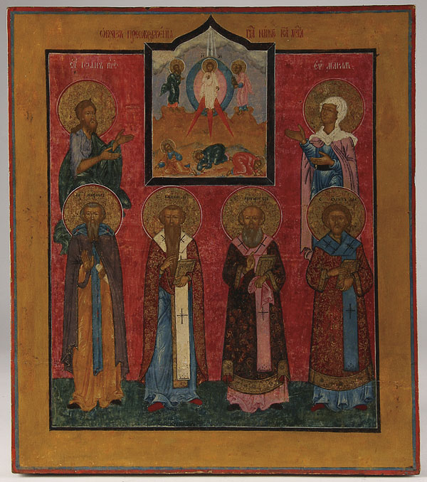A RUSSIAN ICON OF THE TRANSFIGURATION WITH SAINTS, END OF THE 18TH CENTURY. At top center, an icon of the Transfiguration surrounded by a gathering of saints below, from left to right: John the Forerunner, the Venerable Mikhail, the Three Hierarchs- Basil, Gregory and John; and the Holy Maria. 17.5 inches x 15.25 inches (44.3 x 38.8 cm).