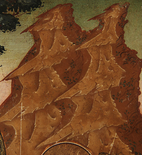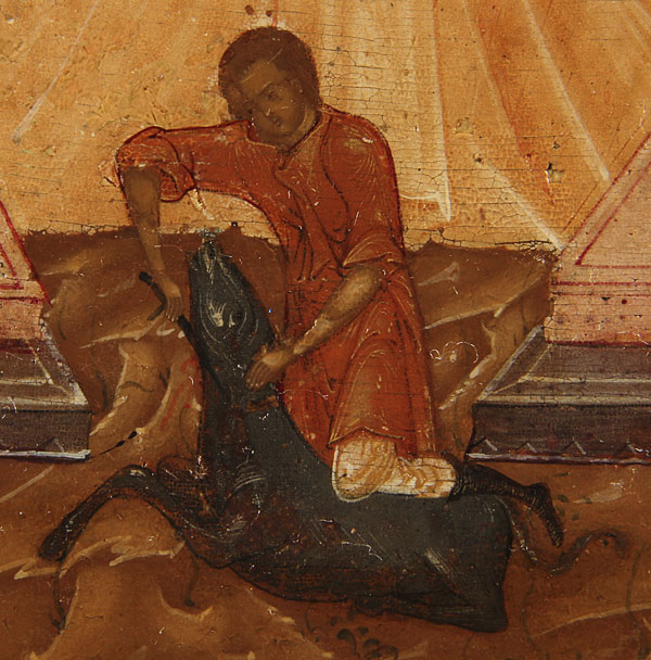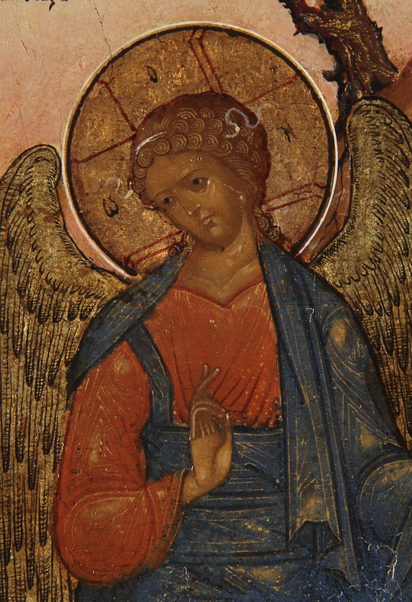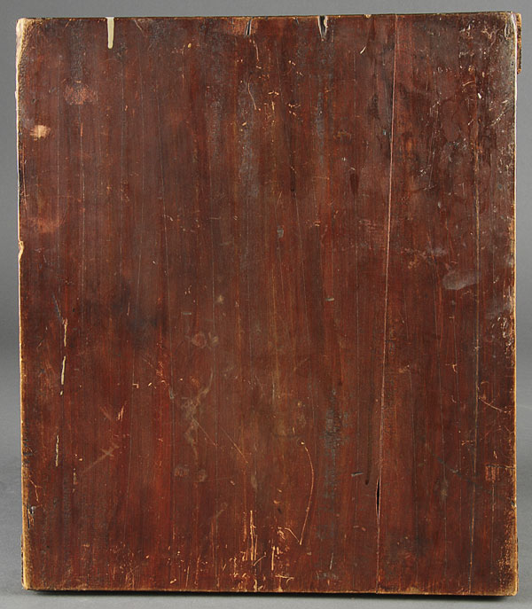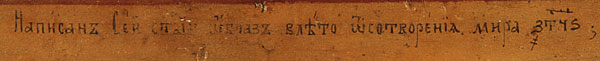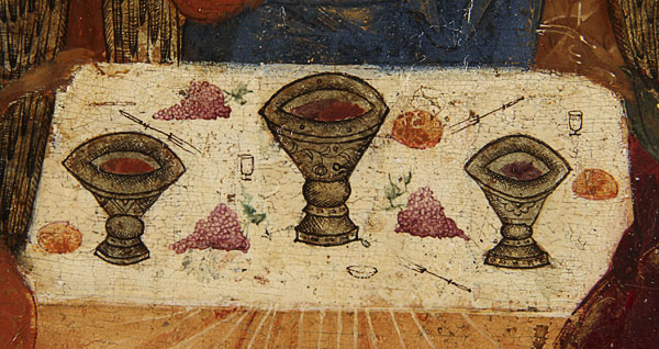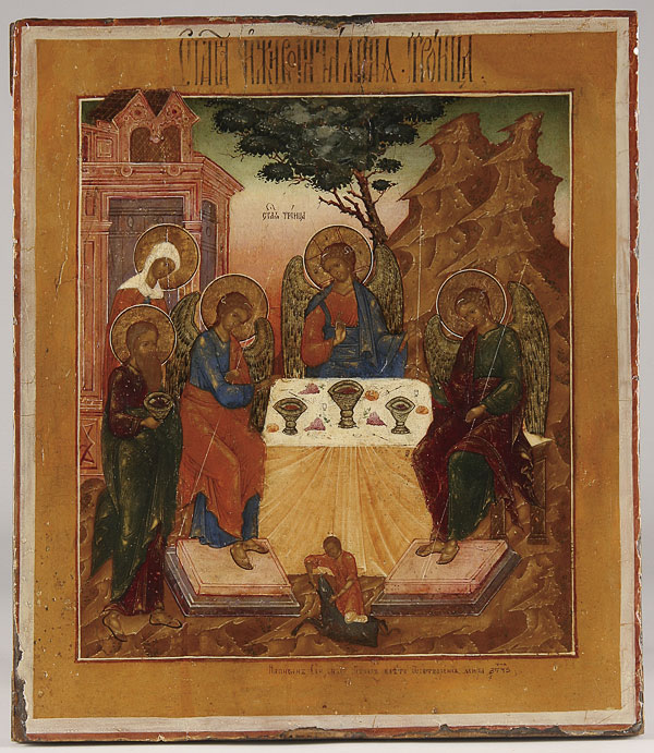 A FINE RUSSIAN ICON OF THE OLD TESTAMENT TRINITY, MSTERA, 1888. A skillfully painted image depicting the three angels who appeared to the Patriarch Abraham at the Oak of Momre, as recorded in chapter 18 of the book of Genesis. At lower left, Abraham serves his guests and behind him is his wife, Sara, at lower center, a servant slays a calf. The ground and hills highly stylized and the sky interestingly gradated in shades of dark red, white and green; the lower margin inscribed "This holy icon was painted in the year from the Creation of the World, 7396 = 1888". Size 14 inches x 12.1 inches (35.5 x 30.7 cm).