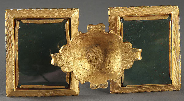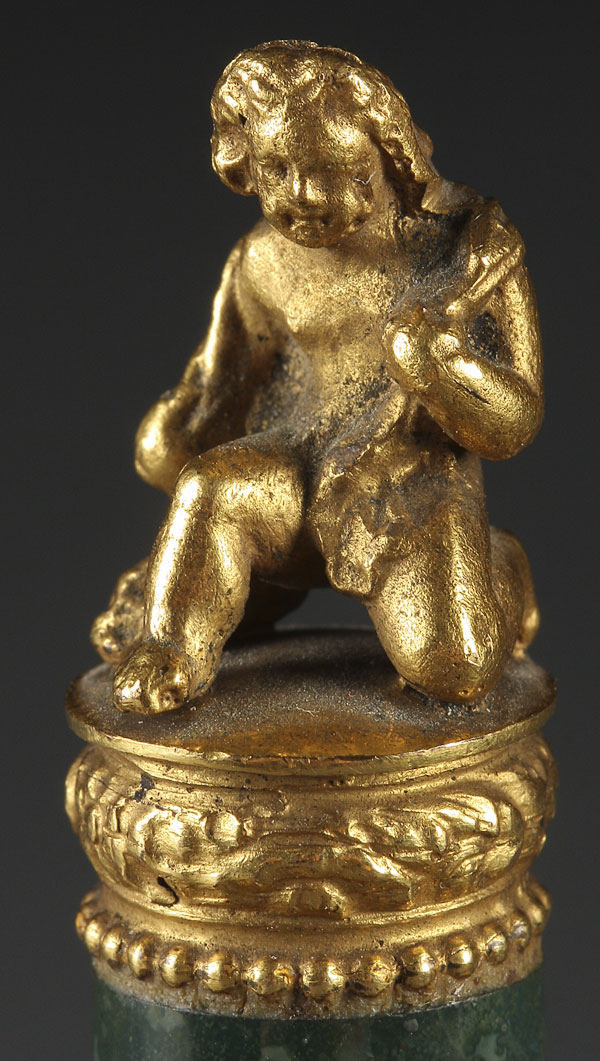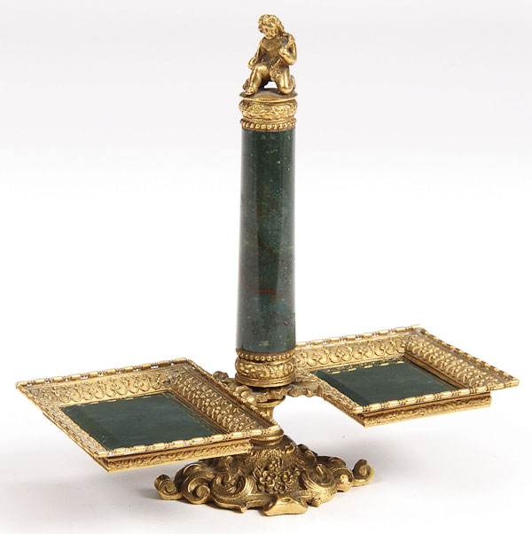 A FINE CONTINENTAL HELIOTROPE AND GILT BRONZE NEO-CLASSIC RING STAND, 19TH CENTURY. The rectangular beveled nephrite tables set in gilt bronze frames flanking a central columnar nephrite handle surmounted with a classical kneeling figure. Height 5.5 inches (14 cm).