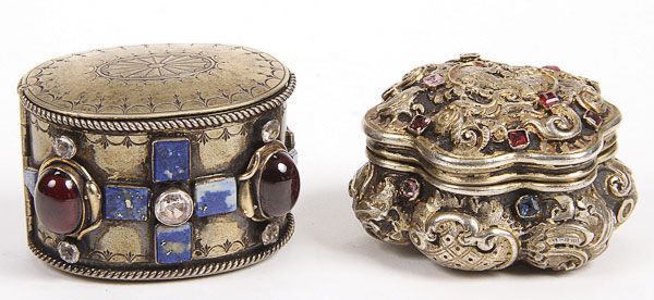 A PAIR OF CONTINENTAL SILVER-GILT AND GEMSTONE SET SNUFF BOXES, 19TH CENTURY. Of Regency and Rococo style, each with later embellishments of various colored stones, one with blue lapis. Length 2 inches, weight 83 grams.