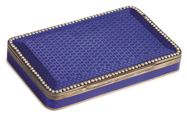 A CONTINENTAL SILVER, SEED PEARL AND ENAMELED CASE, CIRCA 1900. With a rich sapphire blue enamel over an engine turned ground set with a seed pearl bezel. Stamped ".925" Length 2.875 inches (7.2 cm), weight 77 grams.