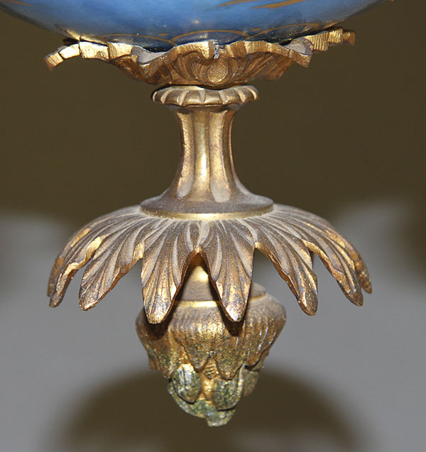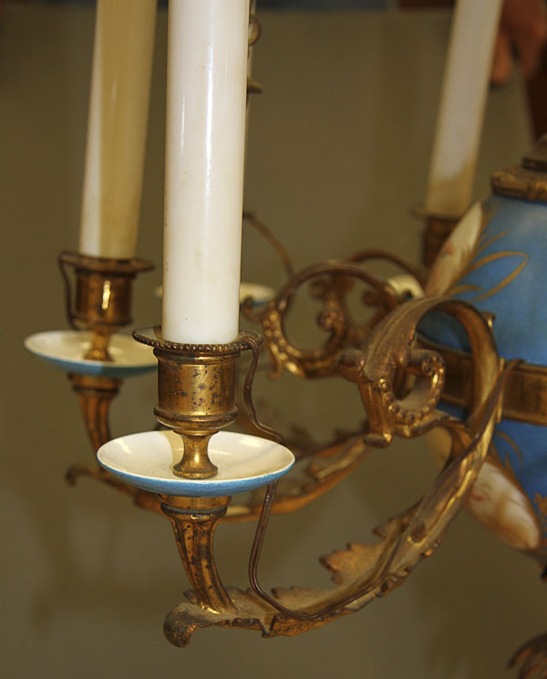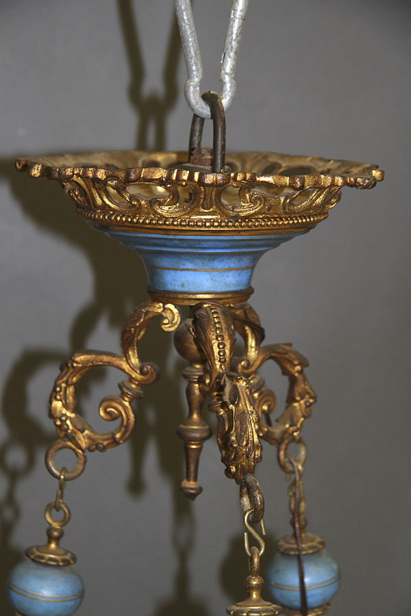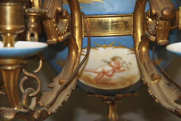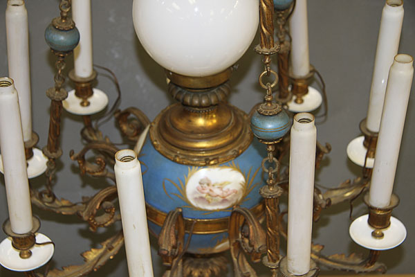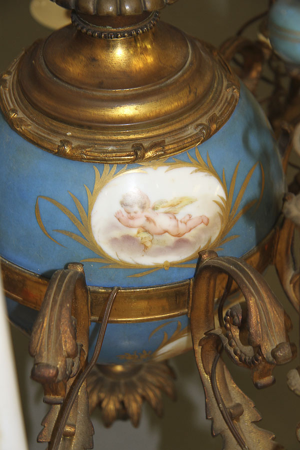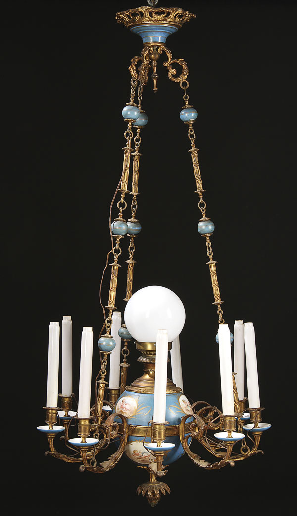 A 19TH CENTURY FRENCH SEVRES STYLE PORCELAIN AND GILT BRONZE CHANDELIER. The sectioned porcelain sphere oil font painted with scenic cartouches of cherubs on a bleu celeste ground with gilt foliates mounted with nine scrolled acanthus arm candle brackets with bleu celeste drip pans below gilt socket terminals, the whole suspended from three gilt bronze chains interspersed with bleu celeste porcelain bead and embossed gilt bronze spindles.The sockets containing later electrical candles. Height 46 inches (117 cm), diameter 22 inches (56 cm).