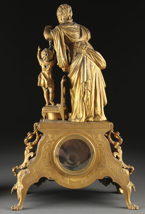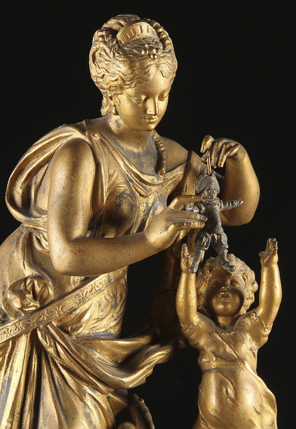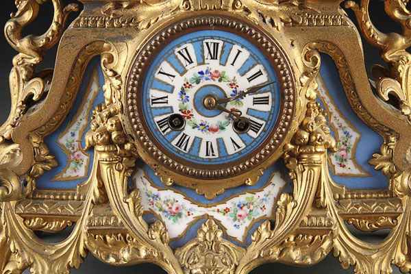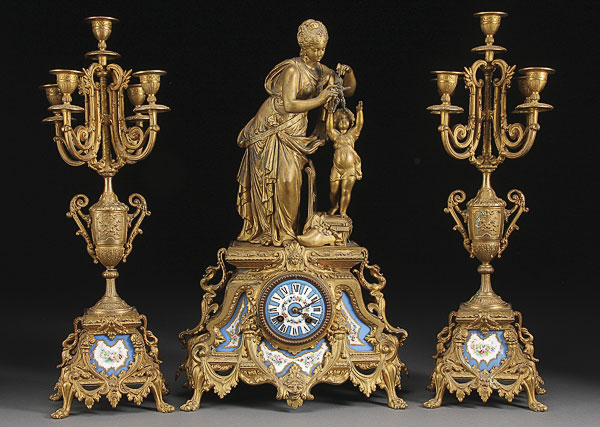 A FRENCH NAPOLEON III SEVRES STYLE PORCELAIN AND ORMOLU CLOCK GARNITURE, LATE 19TH CENTURY. Neatly embossed clock case containing three hand painted porcelain tiles and porcelain clock face surmounted by a large figure of a classical woman and child playing with a doll accompanied by two matching four arm candelabra. Height 20.5 inches (52 cm).