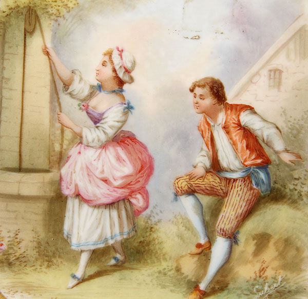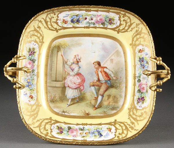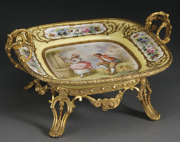 A SEVRES STYLE AND GILT BRONZE CENTER BOWL, LATE 19TH CENTURY. The hand painted scene of a romantic couple artist signed "Lubert" on a lemon yellow ground with floral cartouches, raised on a gilt bronze stand with foliate scrolled handles. Sevres style blue enameled mark. Length 10.5 inches (27 cm).