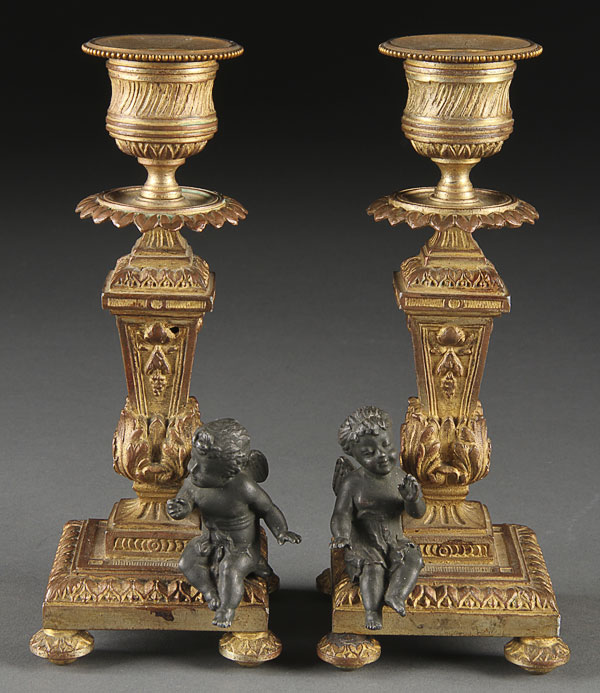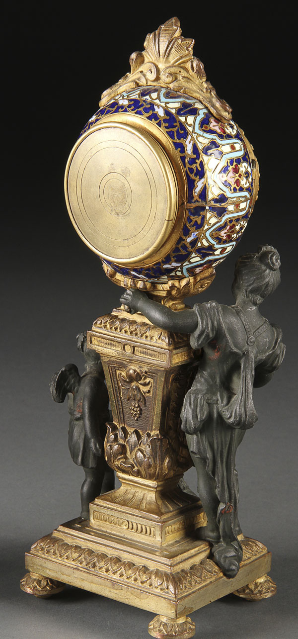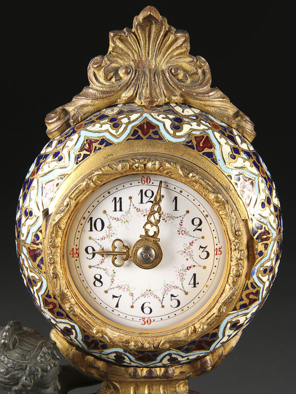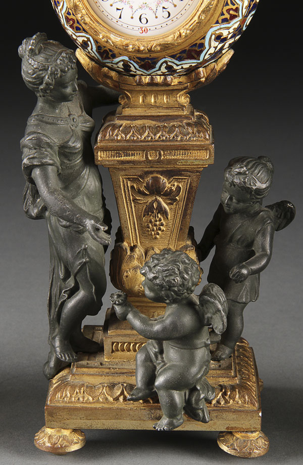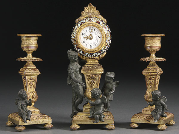 A FRENCH 19TH CENTURY CHAMPLEVÉ ENAMEL AND ORMOLU CLOCK GARNITURE. Comprising the champlevé enameled clock case atop a gilt pedestal mounted with a figural patinated young beauty with two cherubs and accompanied by matching candlesticks. Height 9.25 inches (23.5 cm).