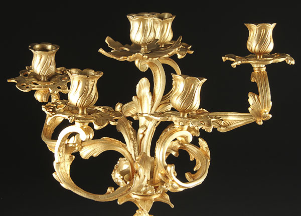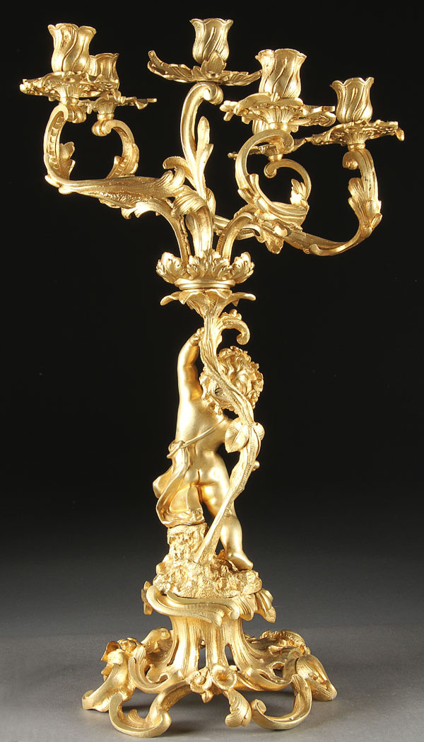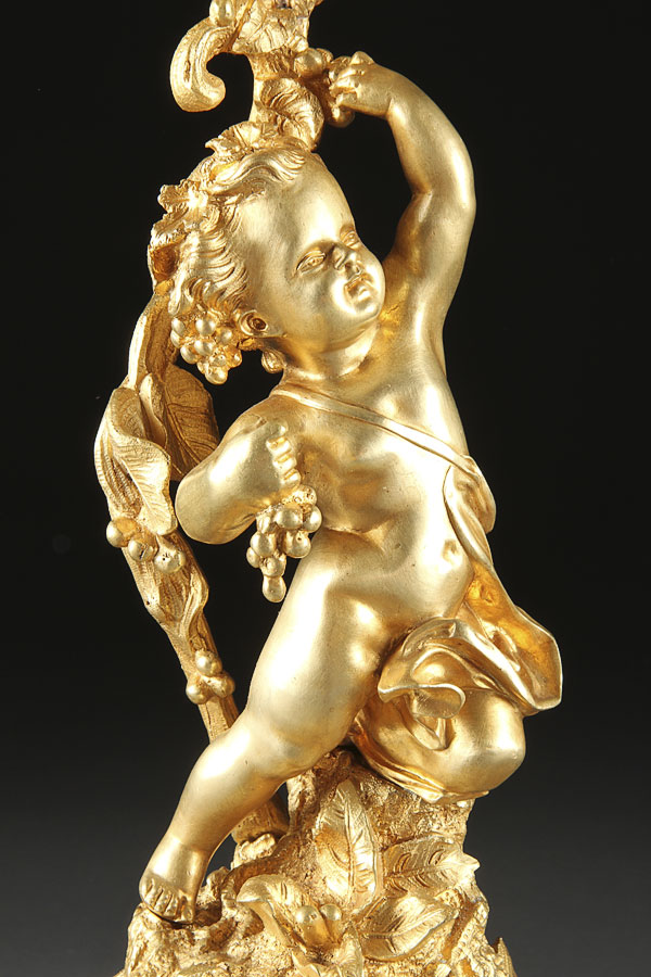 A LARGE PAIR OF FRENCH LOUIS XVI STYLE GILT BRONZE CANDELABRA, 20TH CENTURY. Each depicting a bacchanalian infant raised on a scrolled pedestal and supporting five scrolled acanthus arm candle sockets. Height 24.5 inches (57 cm).